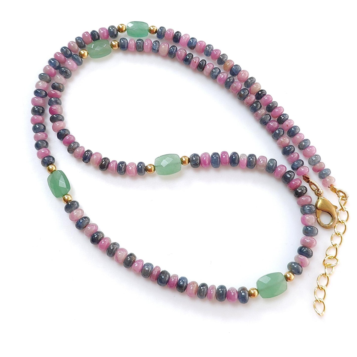 Zoisite Ruby Blue Sapphire Gemstone Beads Necklace: 18.02gms Natural Ruby, Green Quartzite Gemstone Plain Rondelle Brass Necklace 4mm 18"