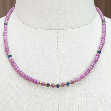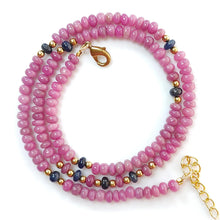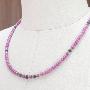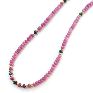 Ruby Gemstone Beads Necklace: 23gms Natural Untreated Ruby, Blue Sapphire Plain Rondelle Brass Necklace 4.5mm - 5mm 18"
