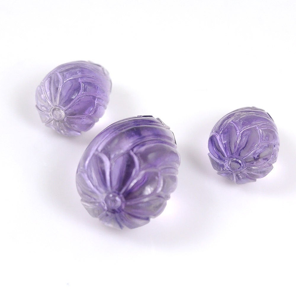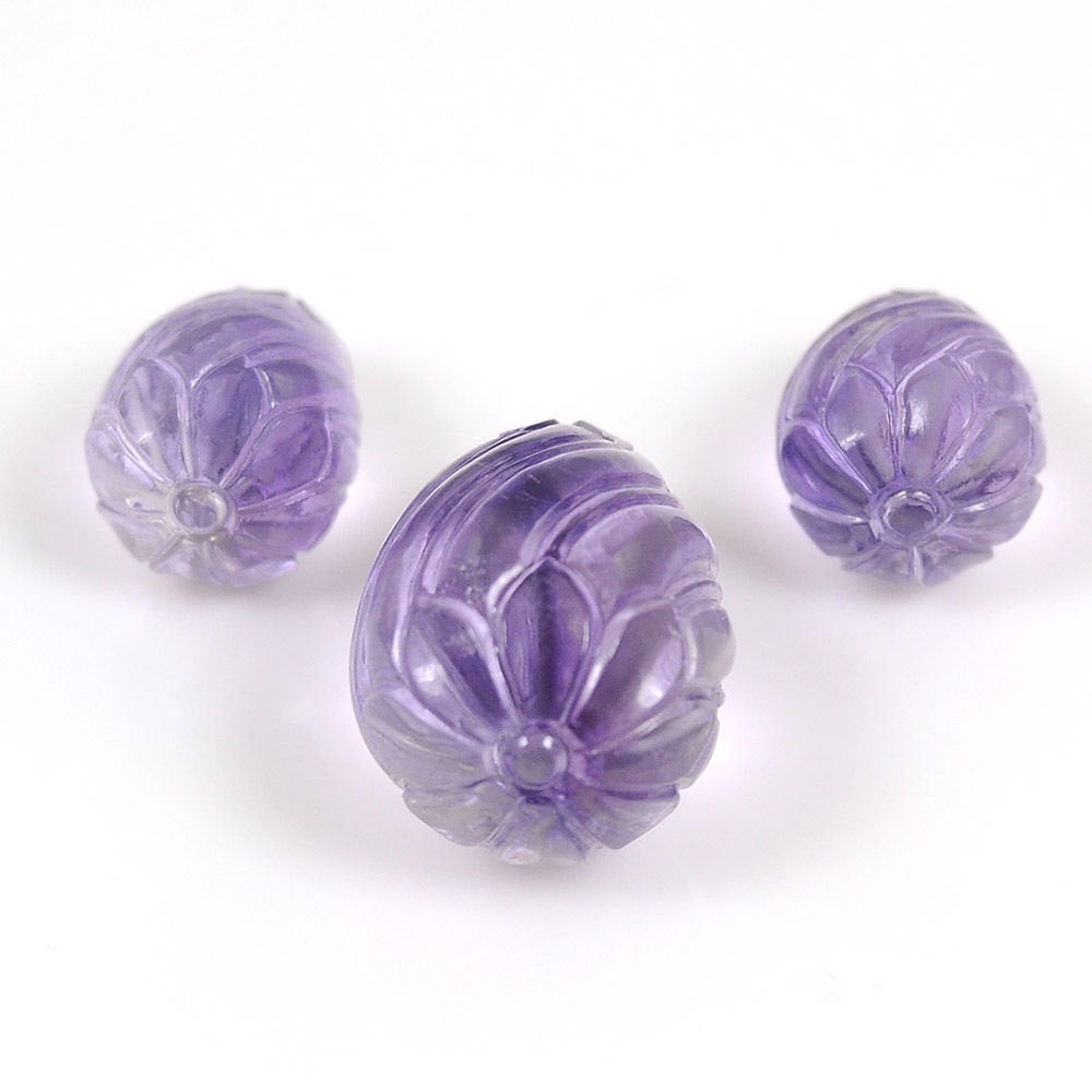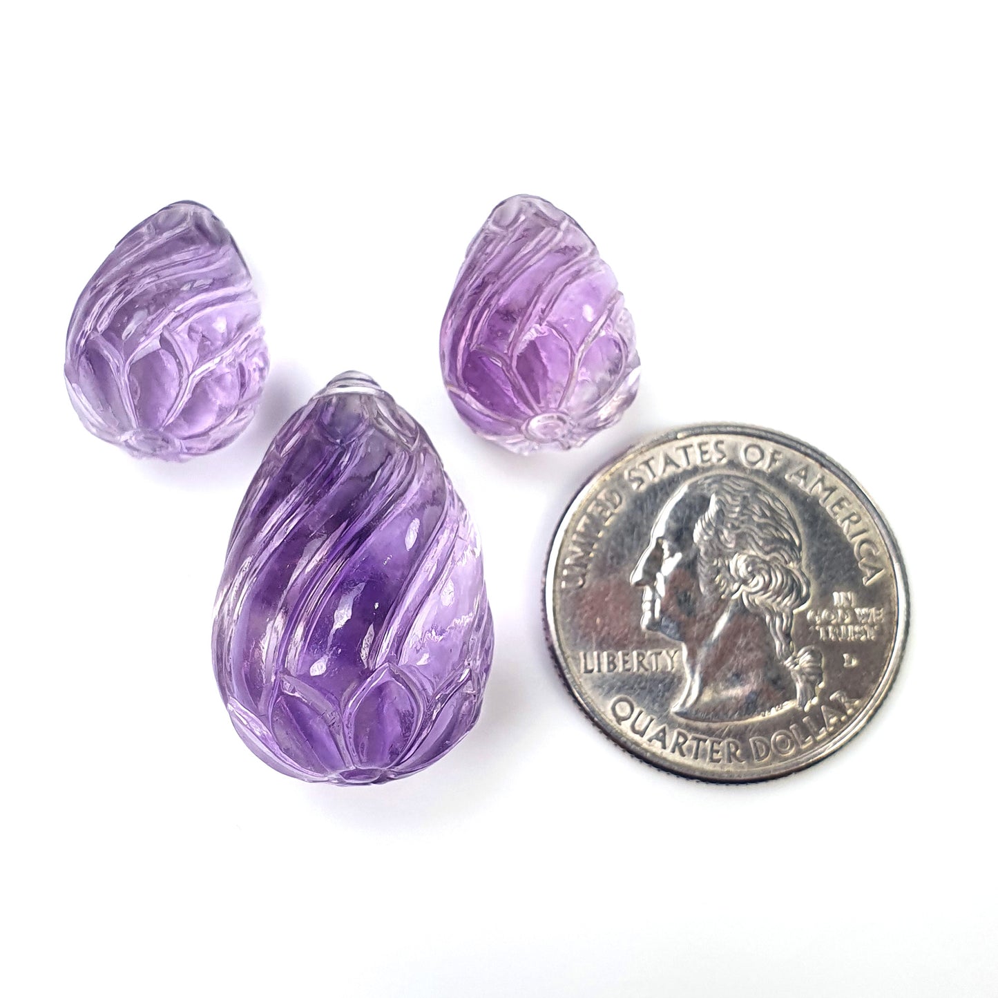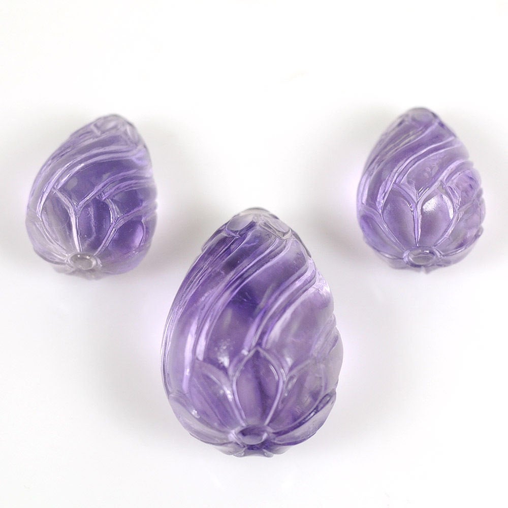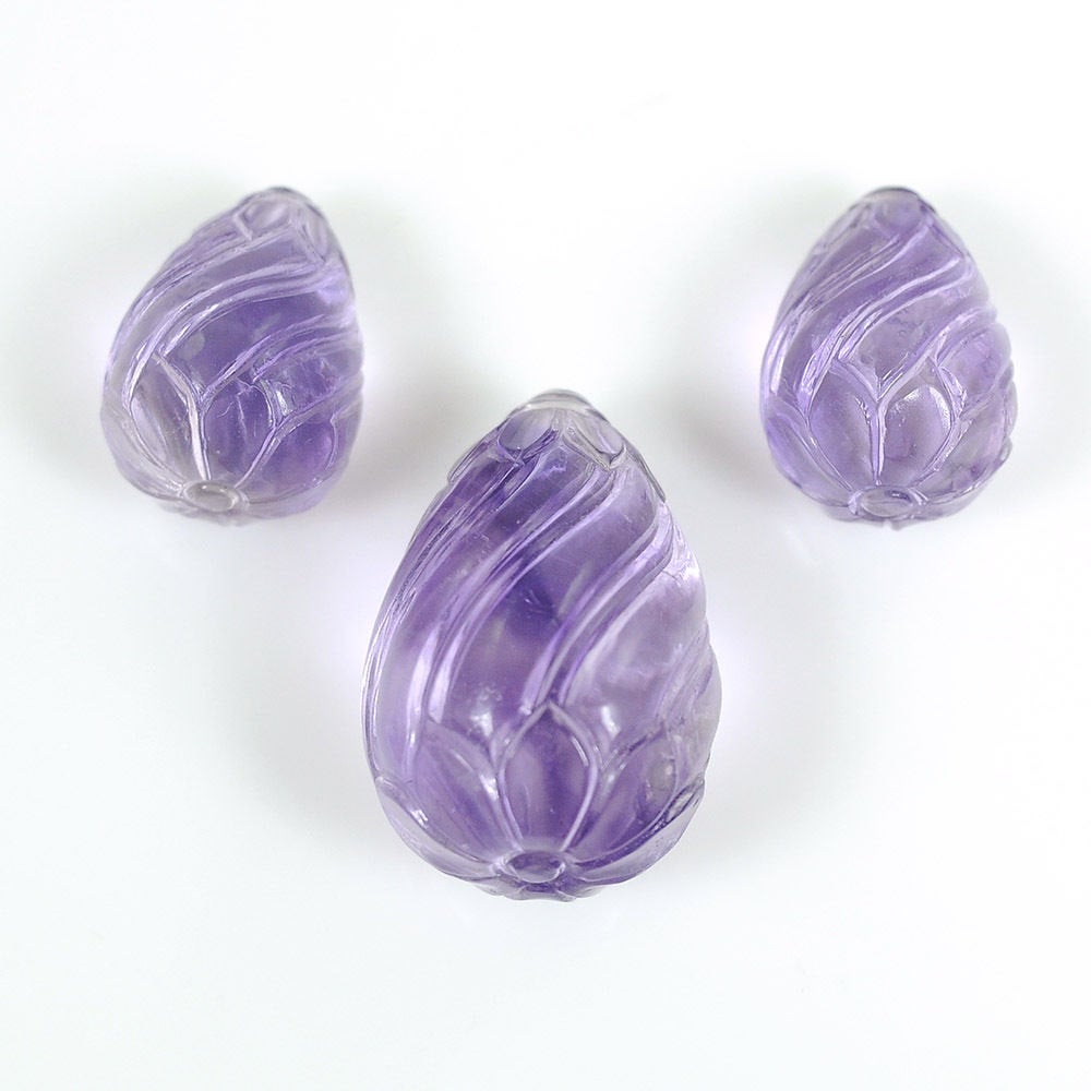 Purple AMETHYST Gemstone Carving : 84.50cts Natural Untreated Amethyst Hand Carved Tear Drops 18mm - 26mm 3pcs (With Video)