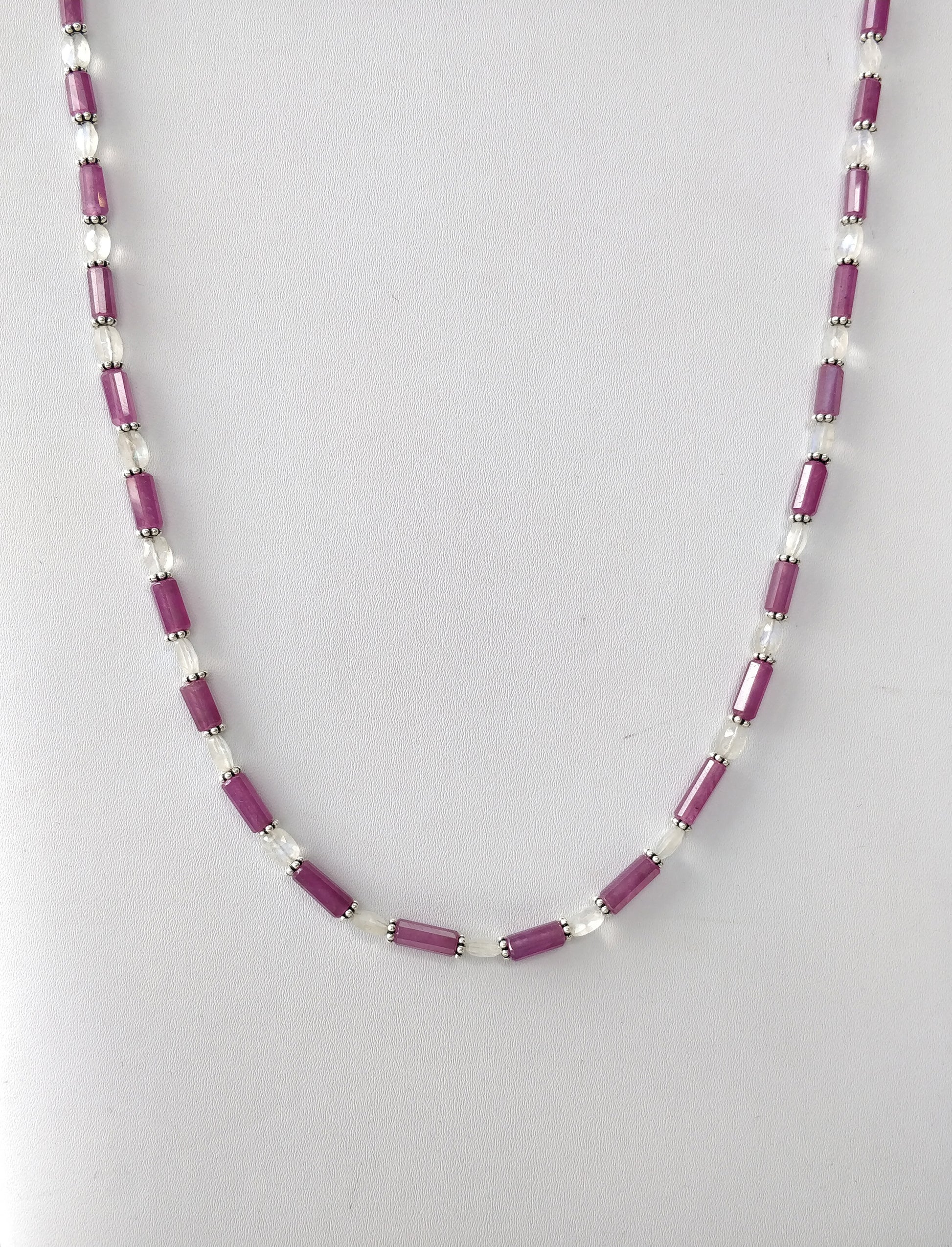 Raspberry Sapphire & Rainbow Moonstone Gemstone Fancy Cut NECKLACE: 95.35gms Natural Untreated Pencil 925 Sterling Silver 6mm - 10mm 19.25"