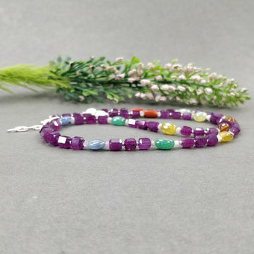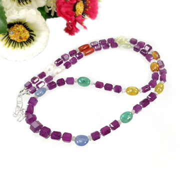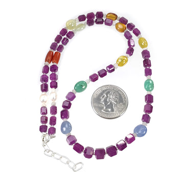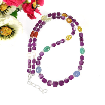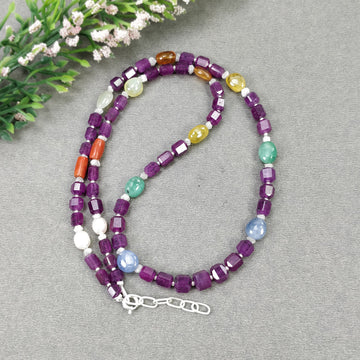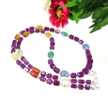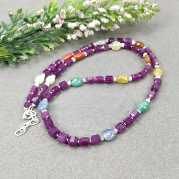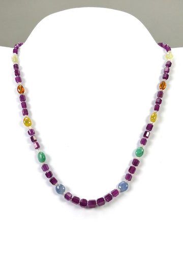 Multi Sapphire Hessonite Coral Diamond Emerald Cat's Eye Pearl Nav Ratan Necklace : 25.60gms Natural 4.5mm - 9*7mm 19.5"