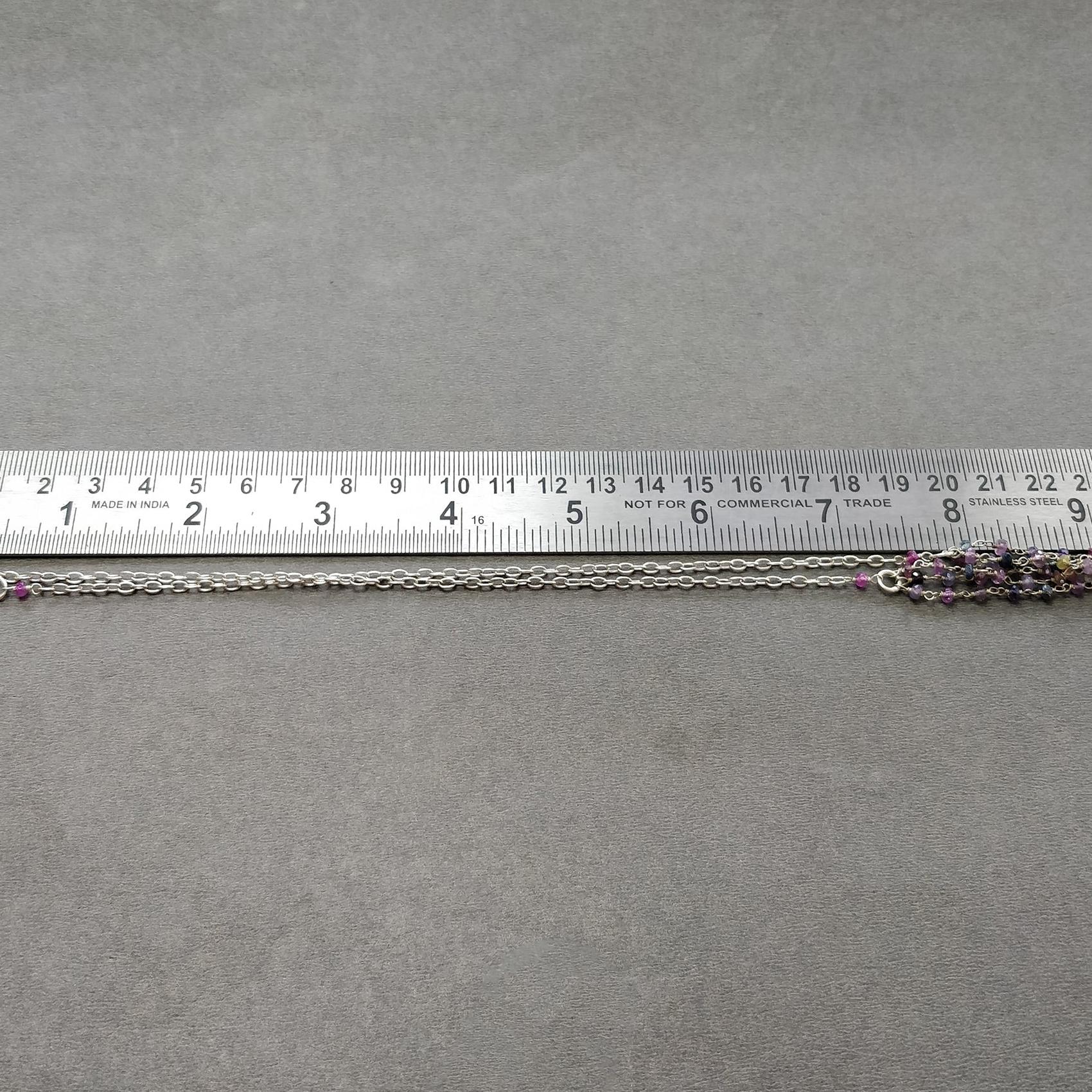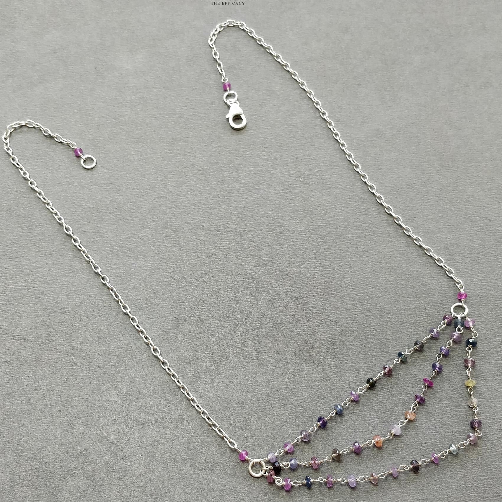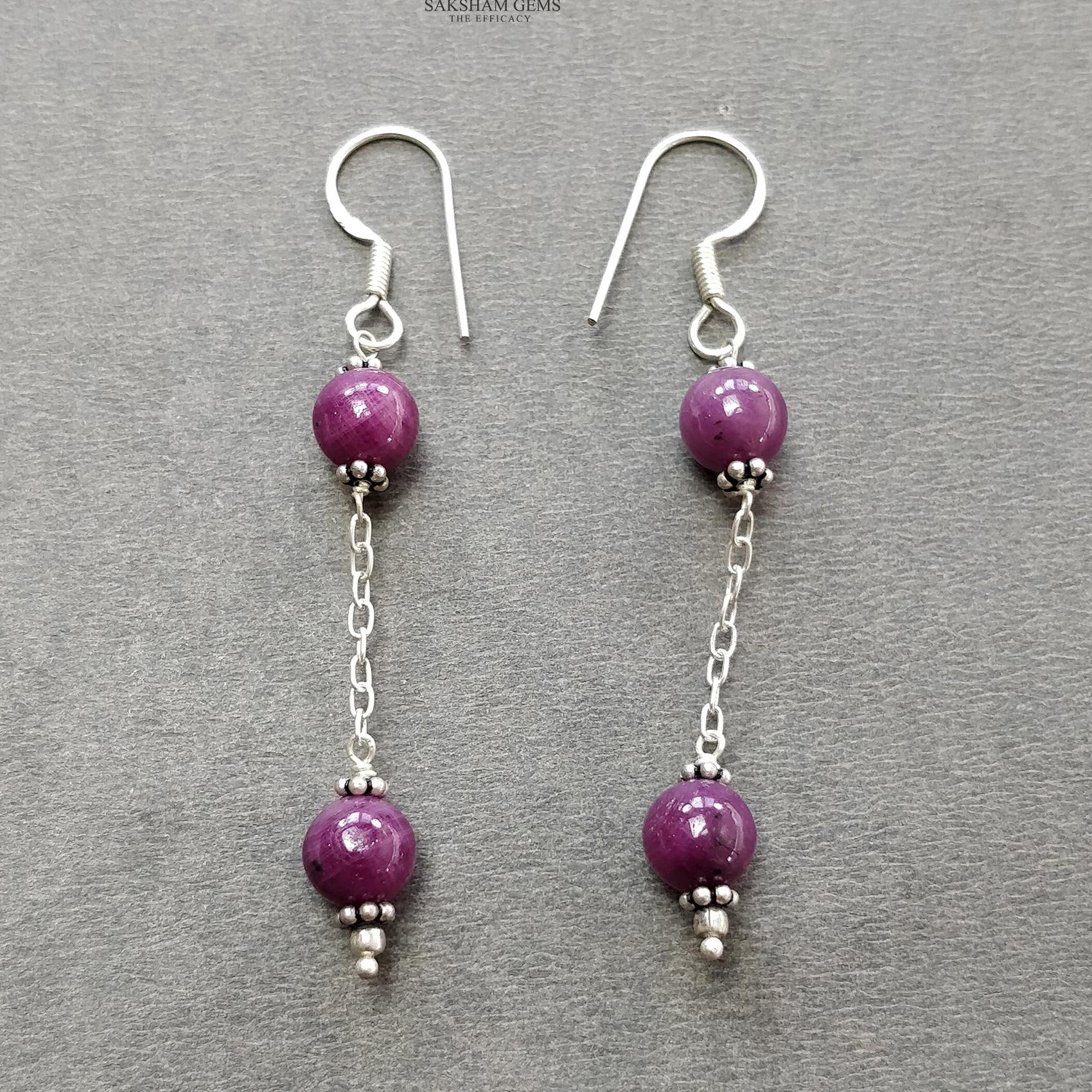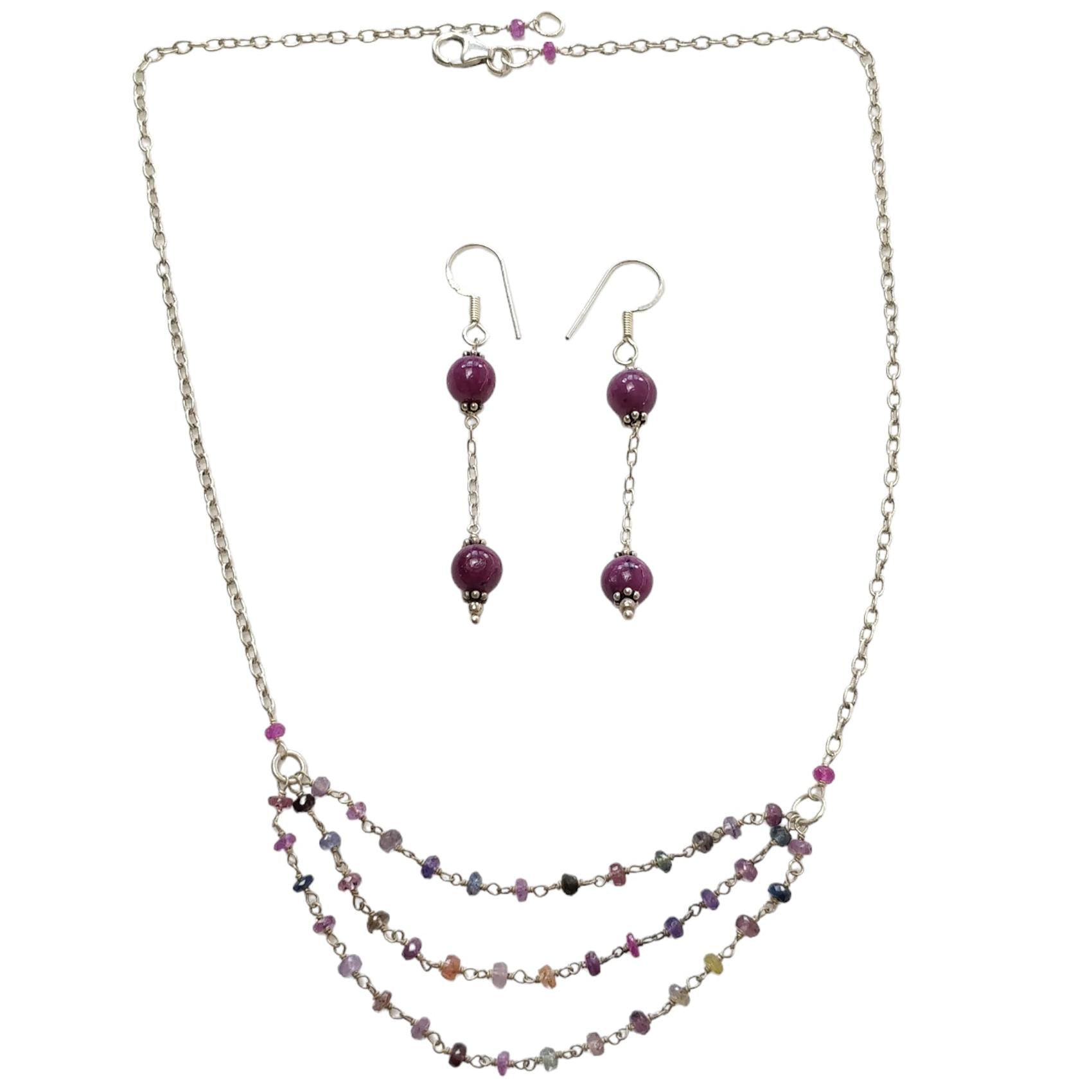 Ruby & Multi Sapphire Gemstone With 925 Sterling Silver Jewelry : 10.68gms Natural Untreated Ruby Round Shape Beaded Earrings Necklace Set