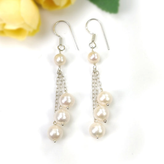 WHITE PEARL Gemstone 925 Sterling Silver Earrings : 6.56gms Natural Triple Drop Dangle Beaded Hook Earrings 2.5"