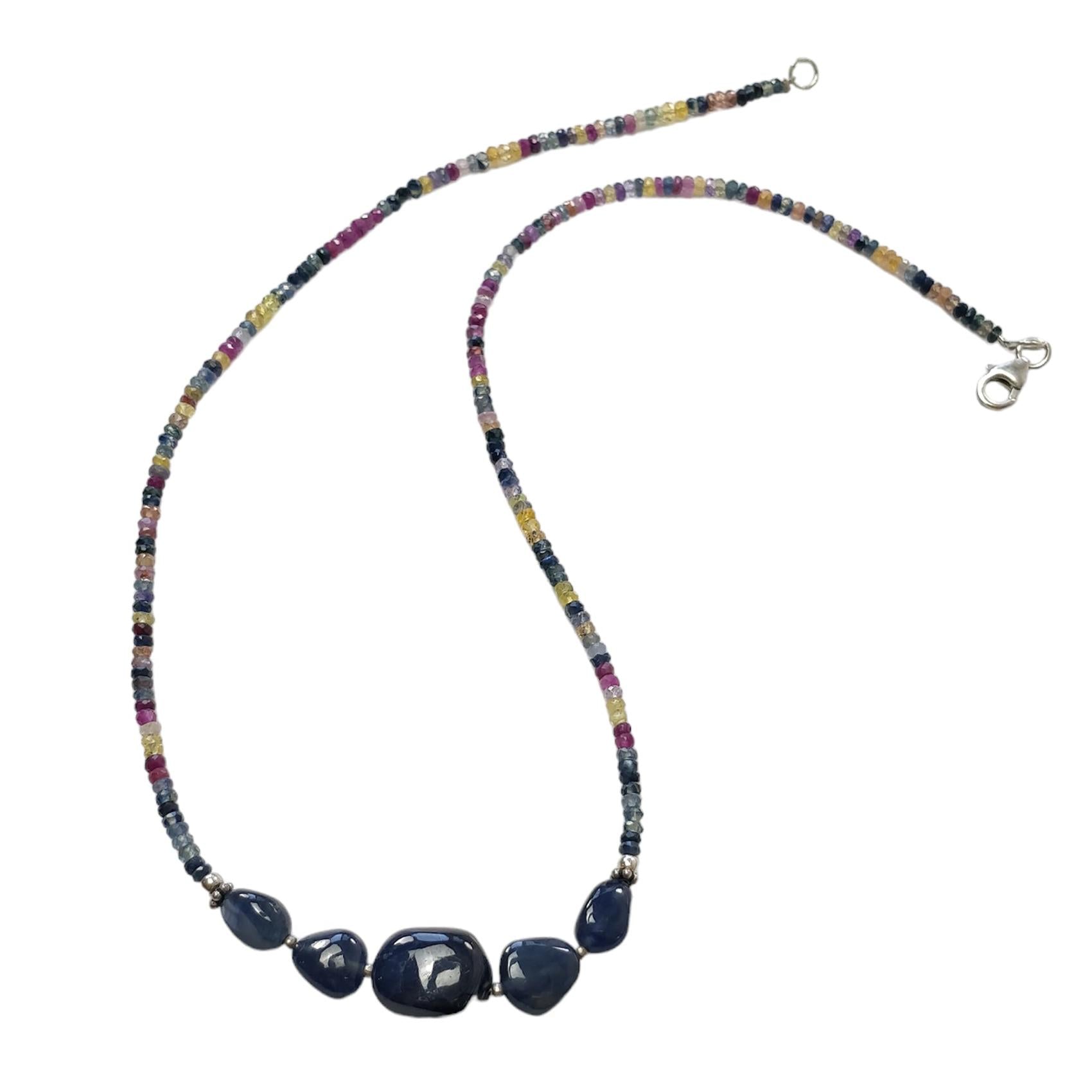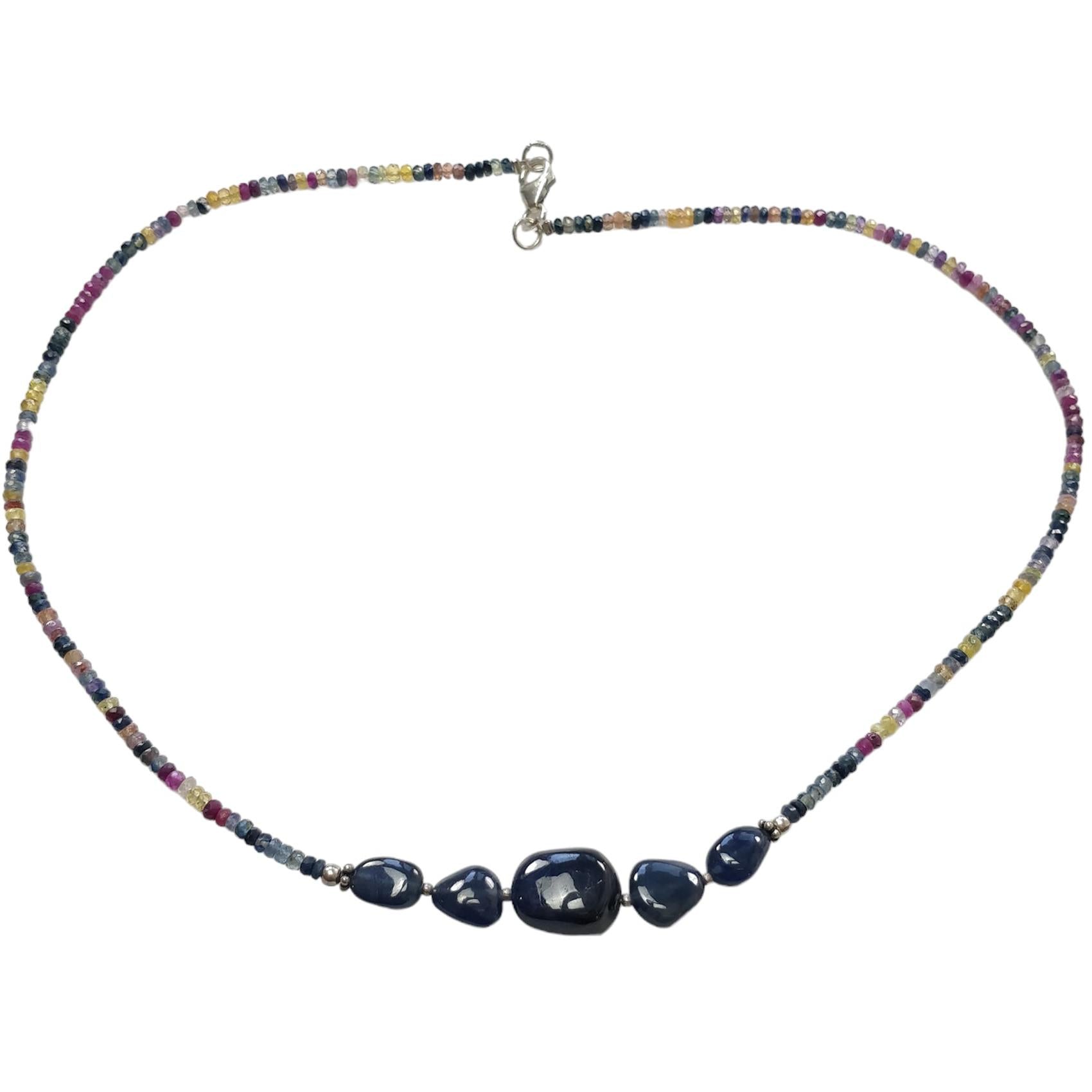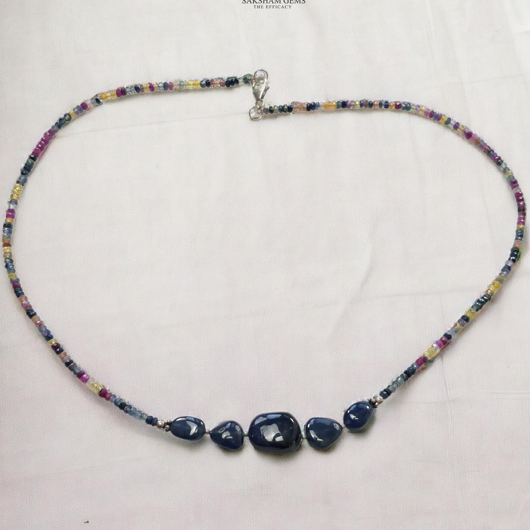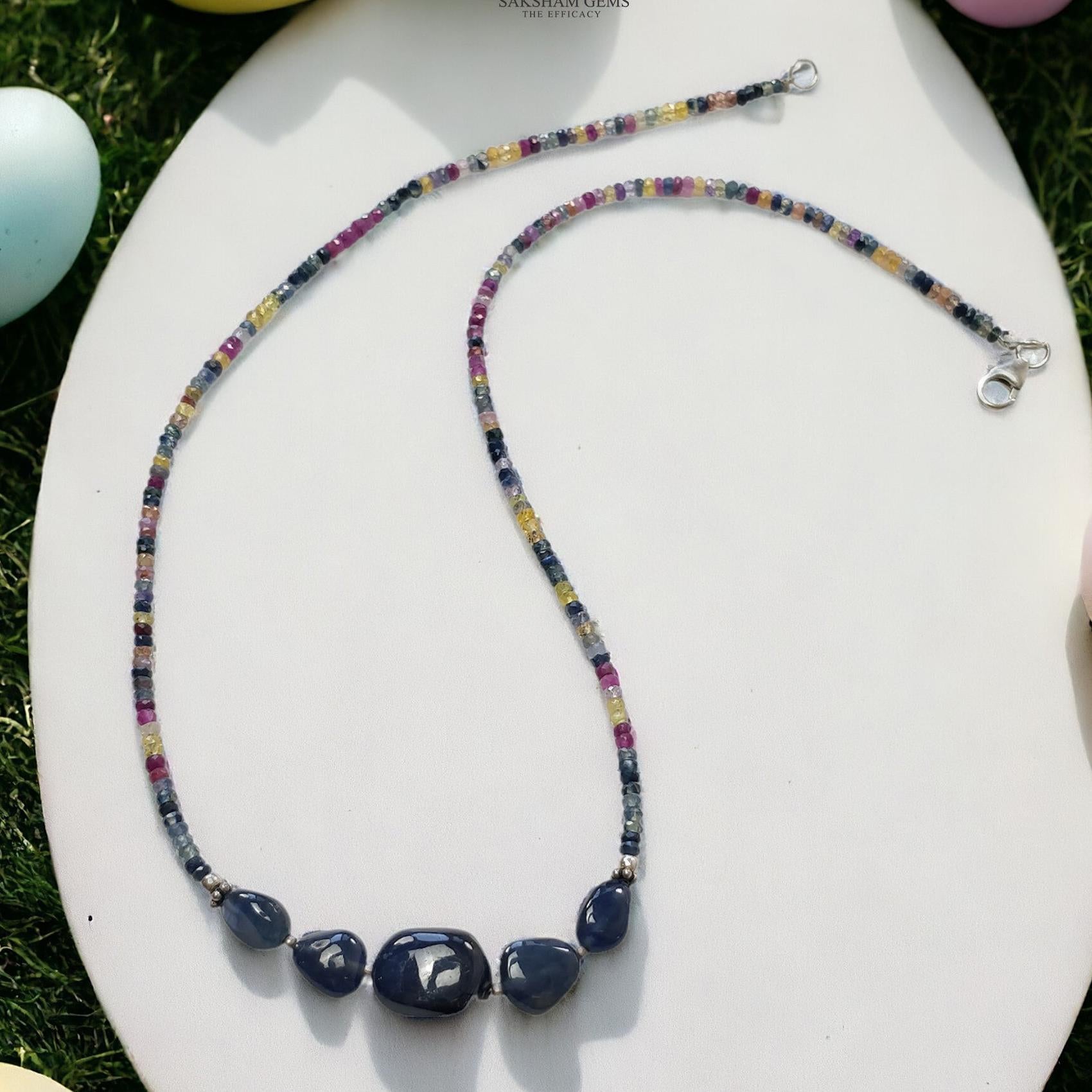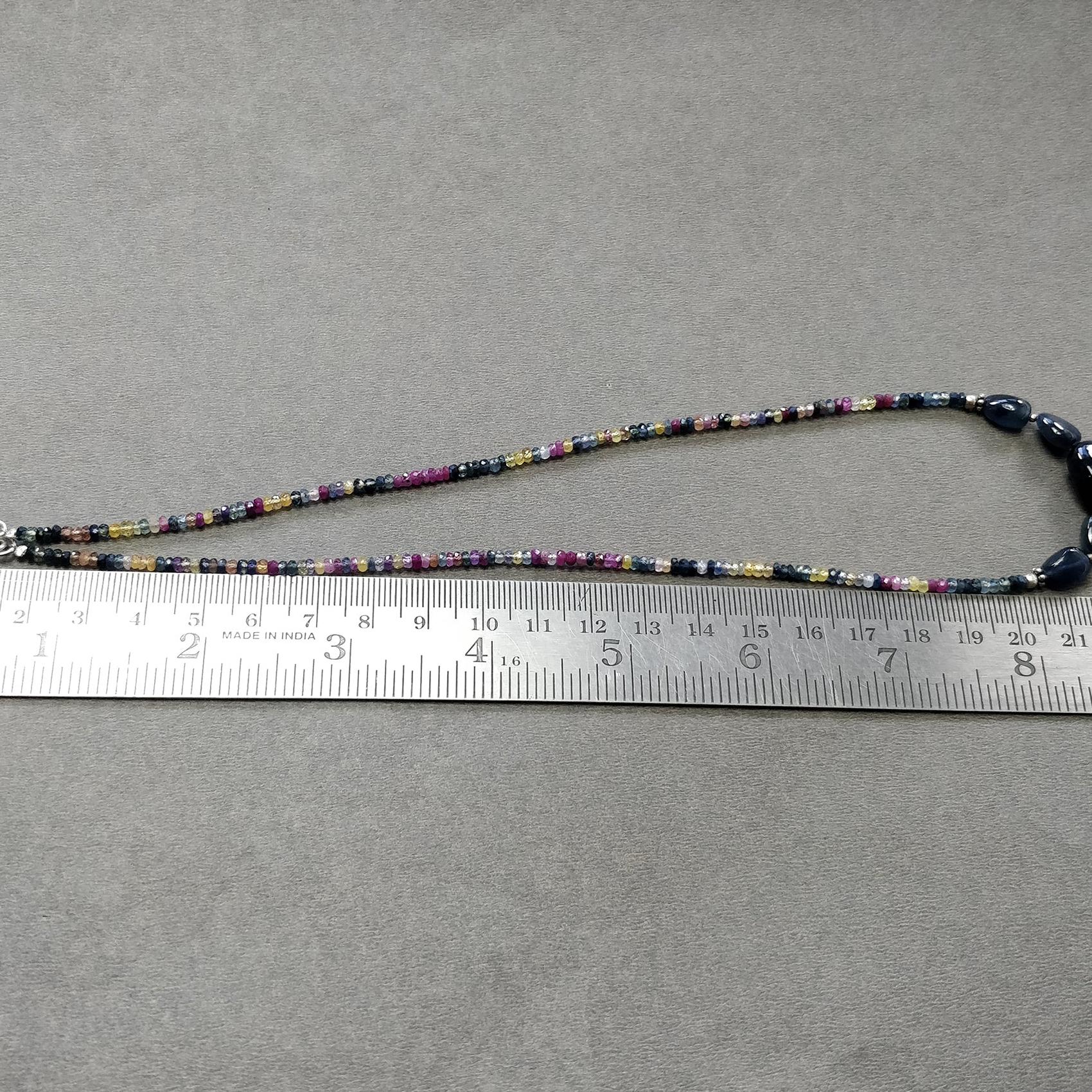 Blue & Multi Sapphire Beads Necklace : 13.87gms Natural Untreated Sapphire 925 Sterling Silver Single Strand Faceted Beaded Necklace 18"