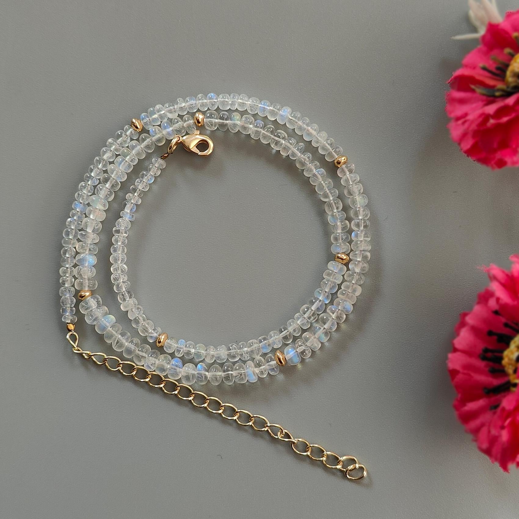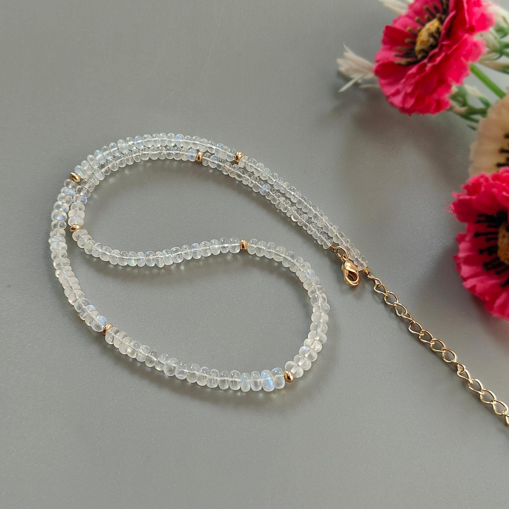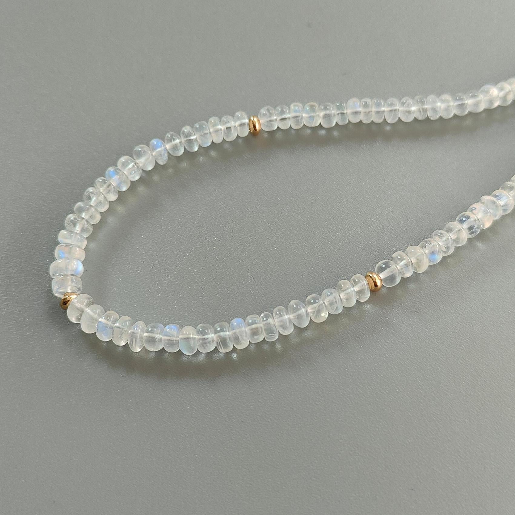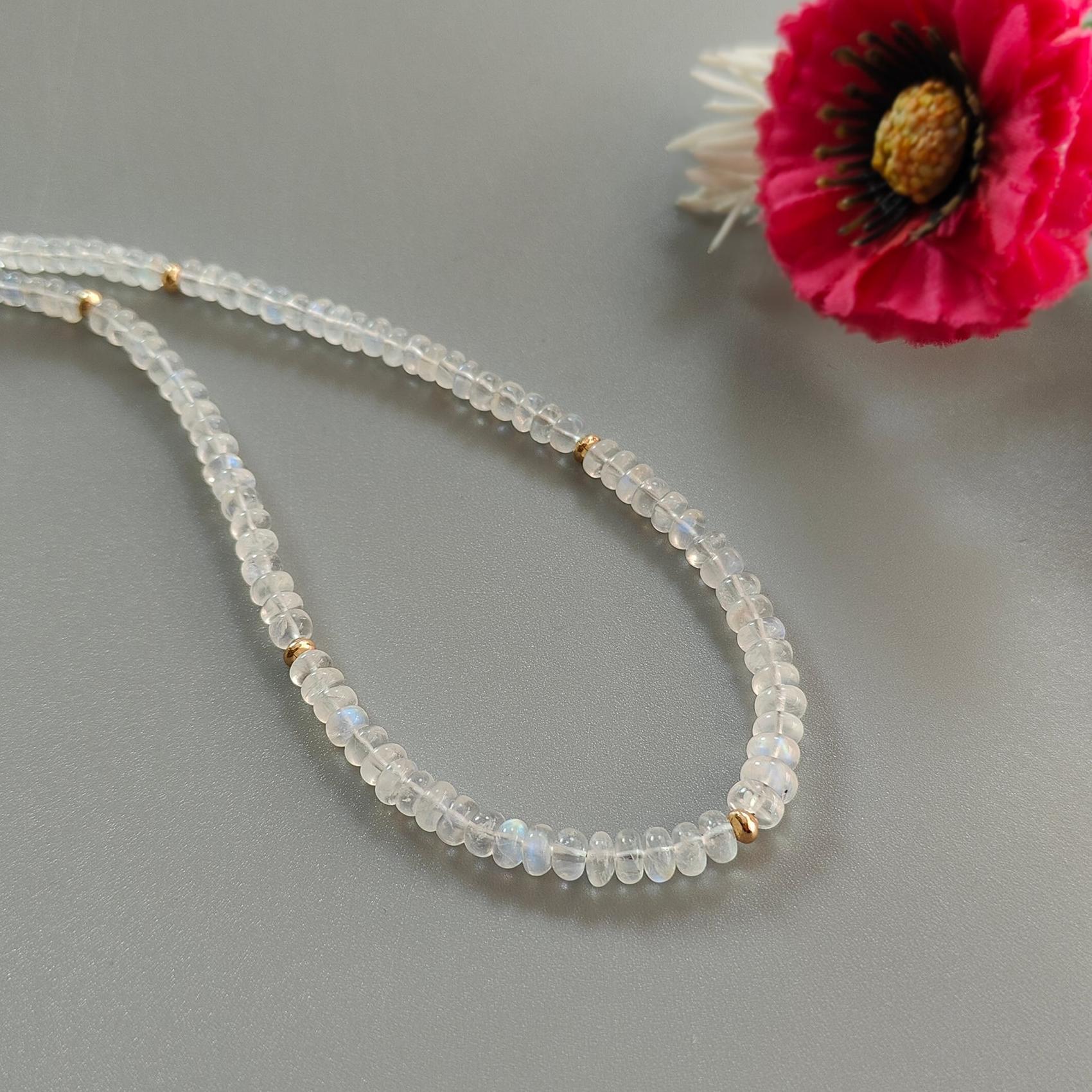 Rainbow Moonstone Gemstone Beads Necklace: 13.88gms Natural Moonstone Plain Rondelle Brass Necklace 16.5" Necklace June Birthstone
