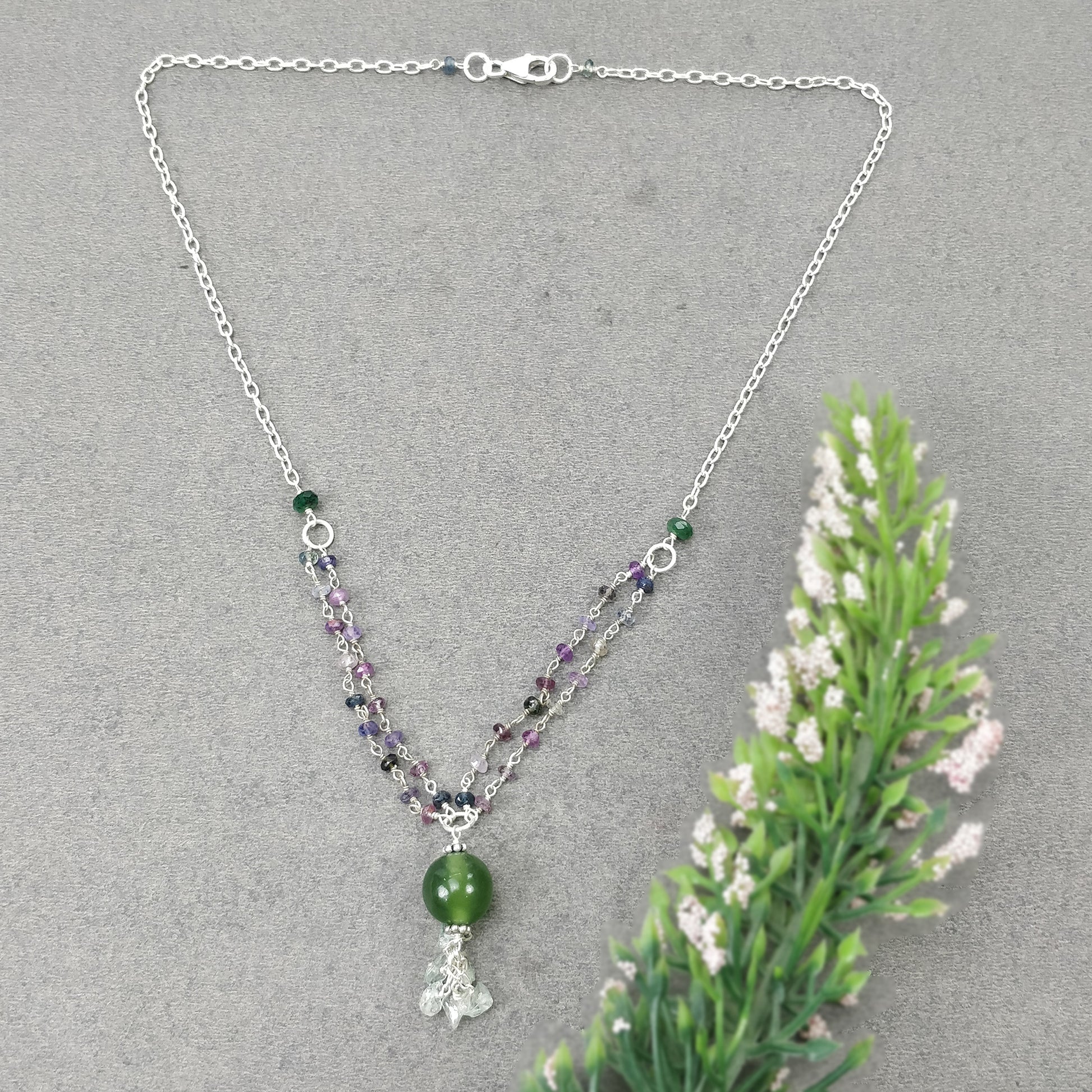 Multi Sapphire & Serpentine Gemstone Beads Chain NECKLACE : 37.30cts Natural Untreated With 925 Sterling Silver Necklace 3mm - 11mm 19.25"