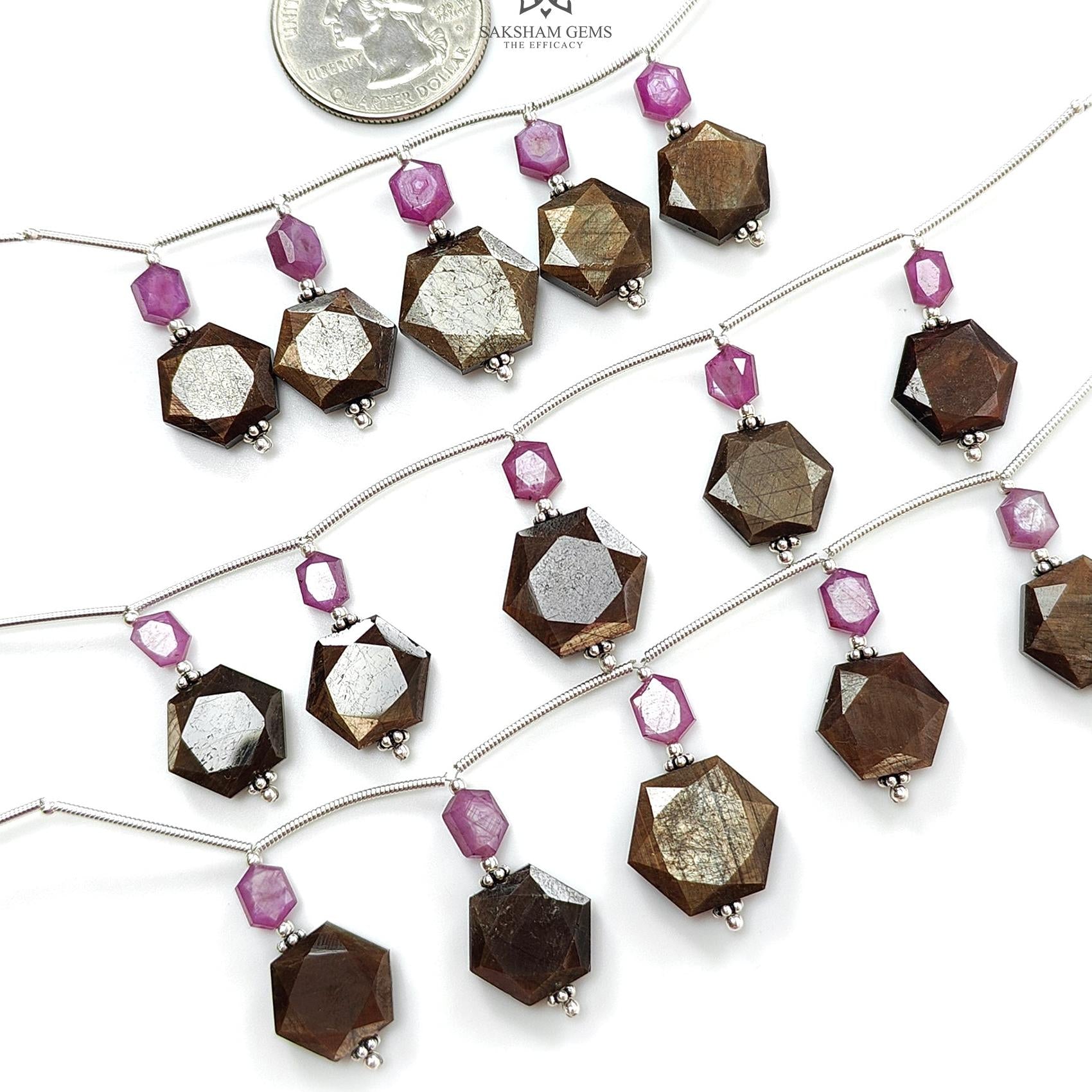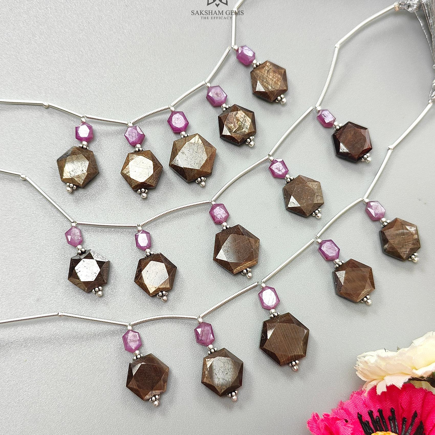 Golden Sapphire & Ruby Faceted Loose Beads: Natural Untreated Sapphire Raspberry Pink Ruby Fancy Cut Hexagon Shape 925 Sterling Silver Beads