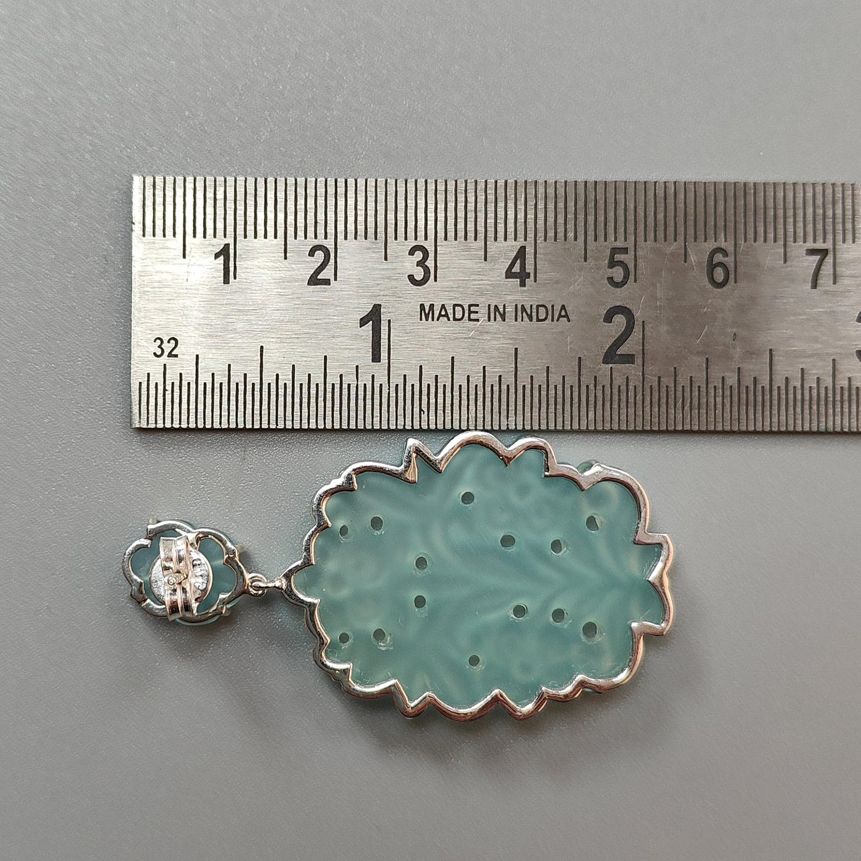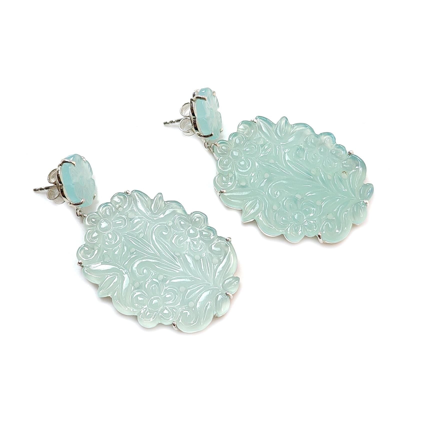 Light Blue Onyx Carving Silver Earring: 17.60gms Natural Onyx Hand Carved Oval Shape 925 Sterling Silver Prong Set Push Back Stud Earring 2"