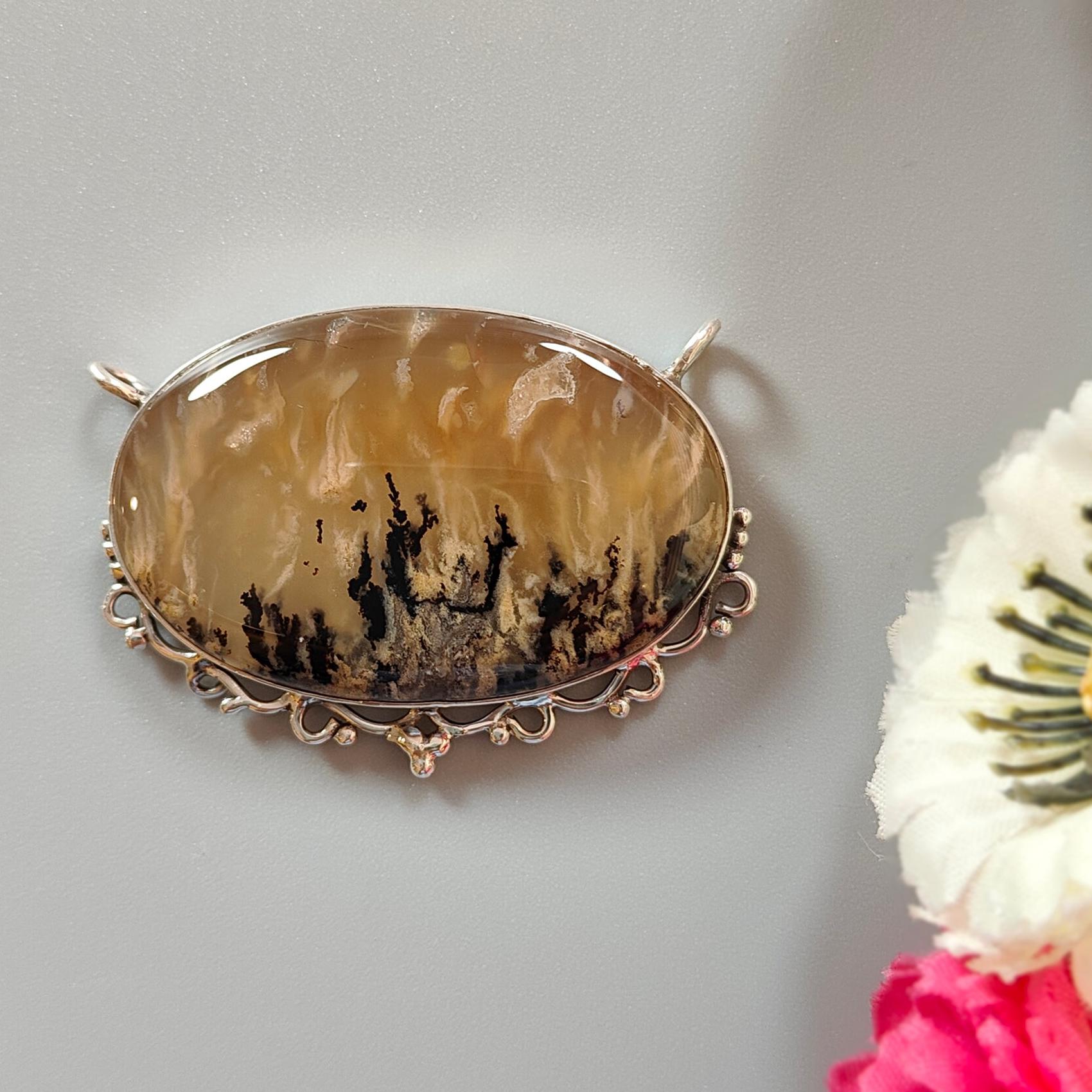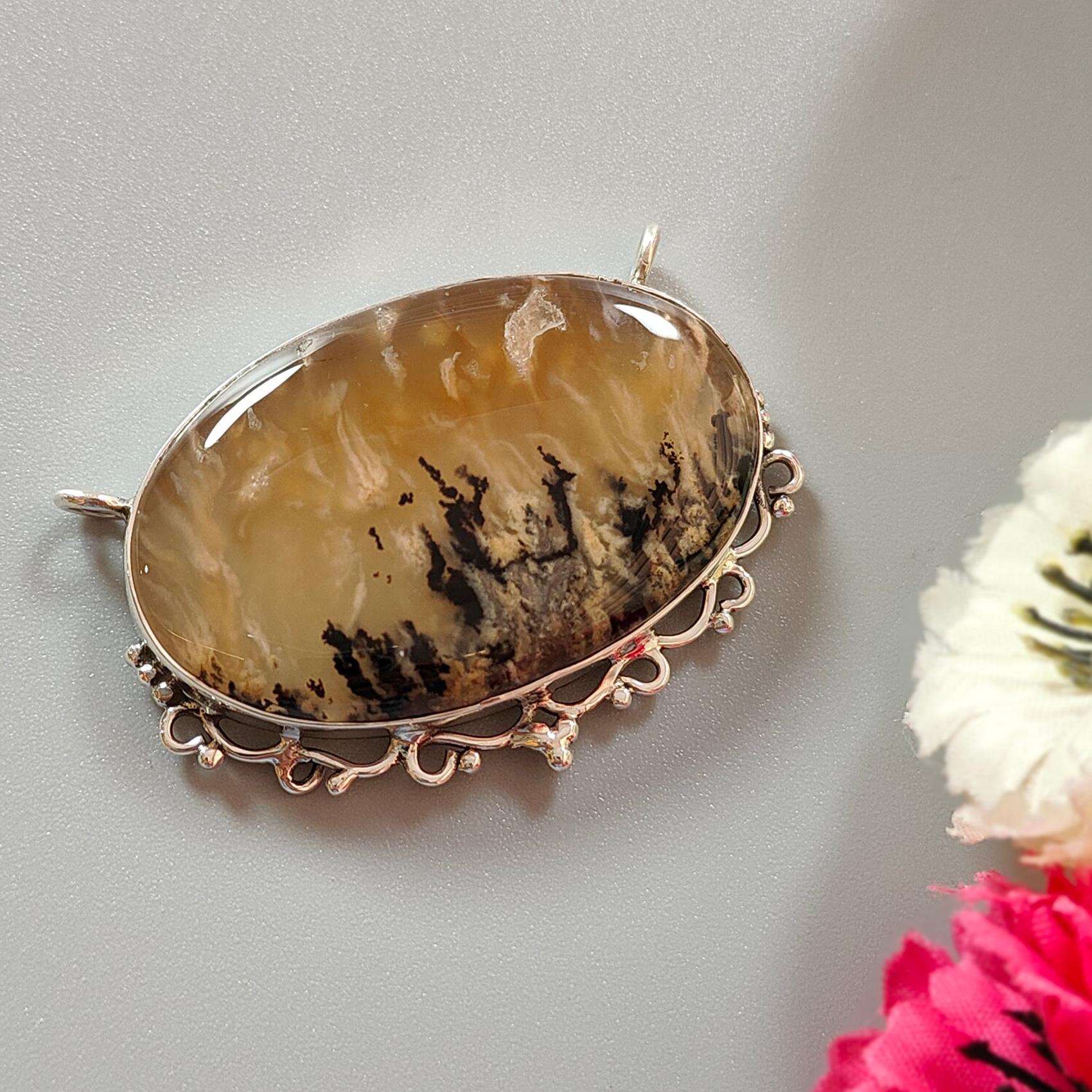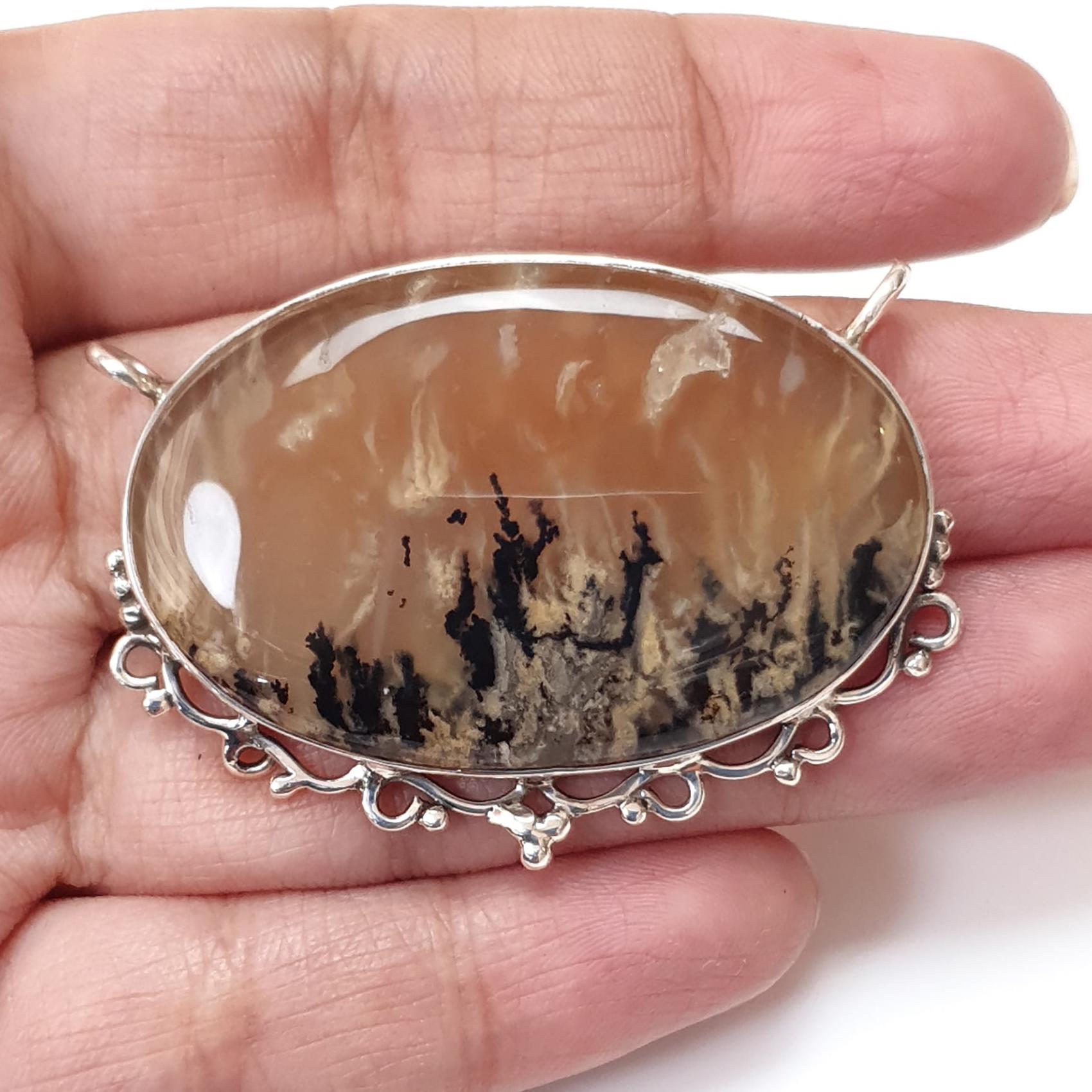 Tiger Dendrite Agate Plain Silver Pendant:15.57gms Natural Untreated Bi-Color Agate Oval 925 Sterling Silver Bezel Set Pendant 2.00"