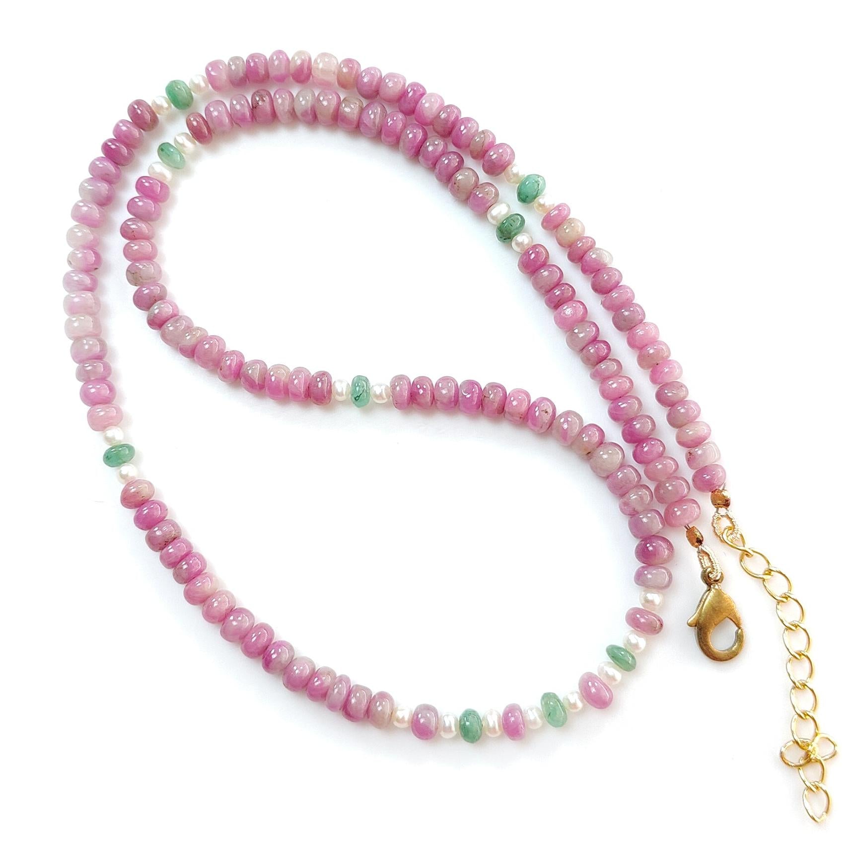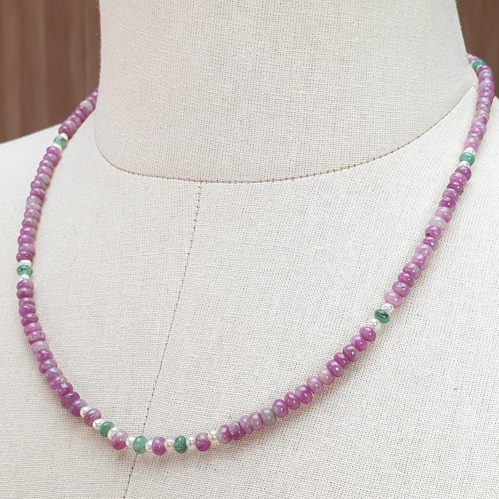 Zoisite Ruby Gemstone Beads Necklace: 19.65gms Natural Untreated Ruby, White Pearl & Emerald Plain Rondelle Brass Necklace 4.5mm - 5mm 18"