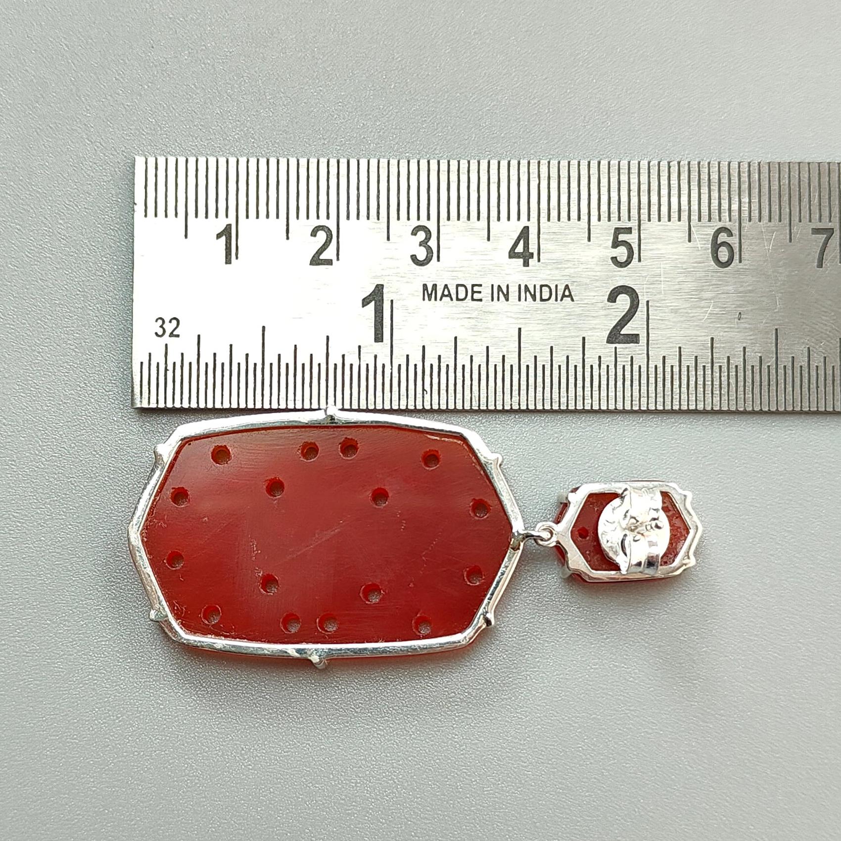 Orange Onyx Carving Silver Earring: 20.10gms Natural Onyx Hand Carved Hexagon 925 Sterling Silver Prong Set Push Back Stud Earring 2.30"