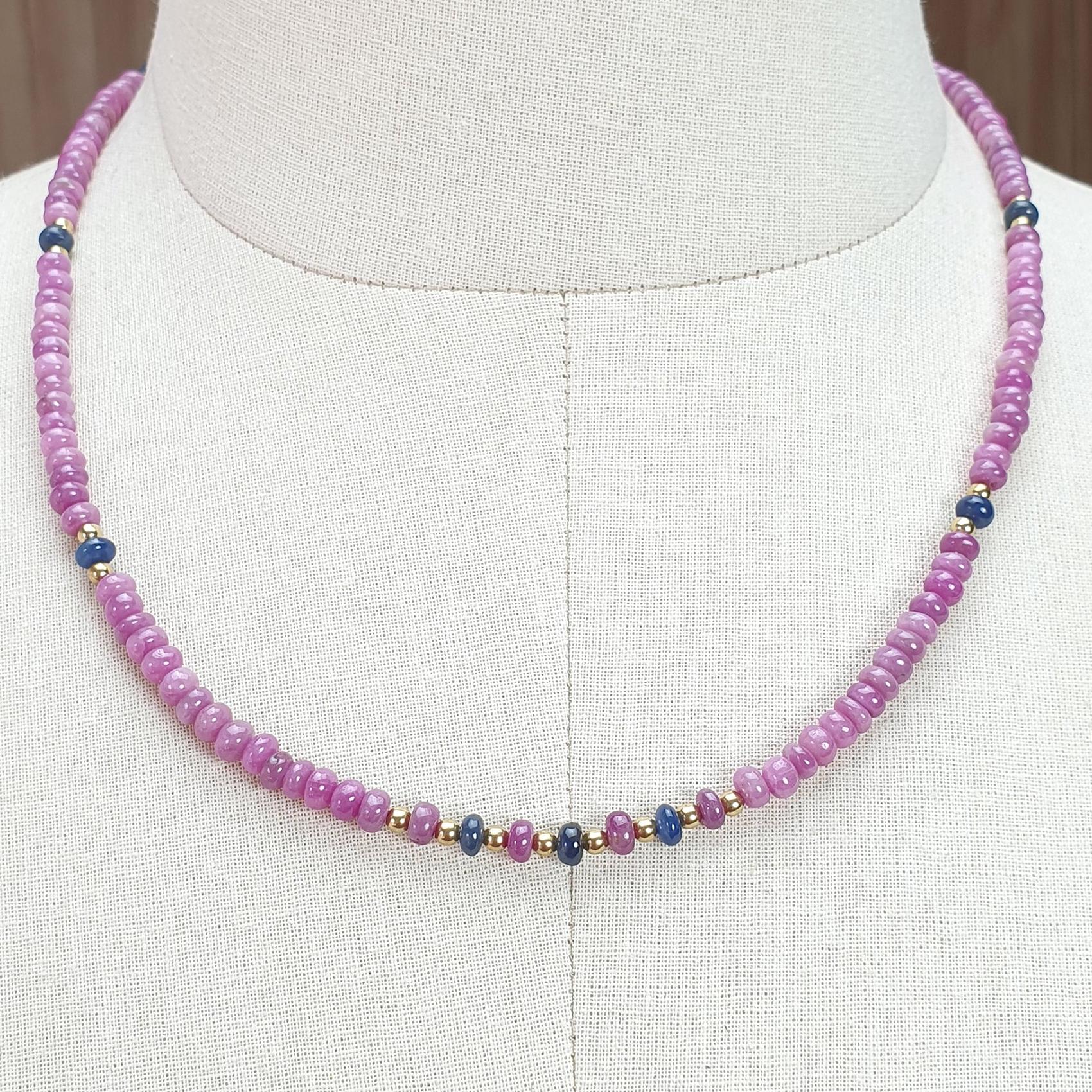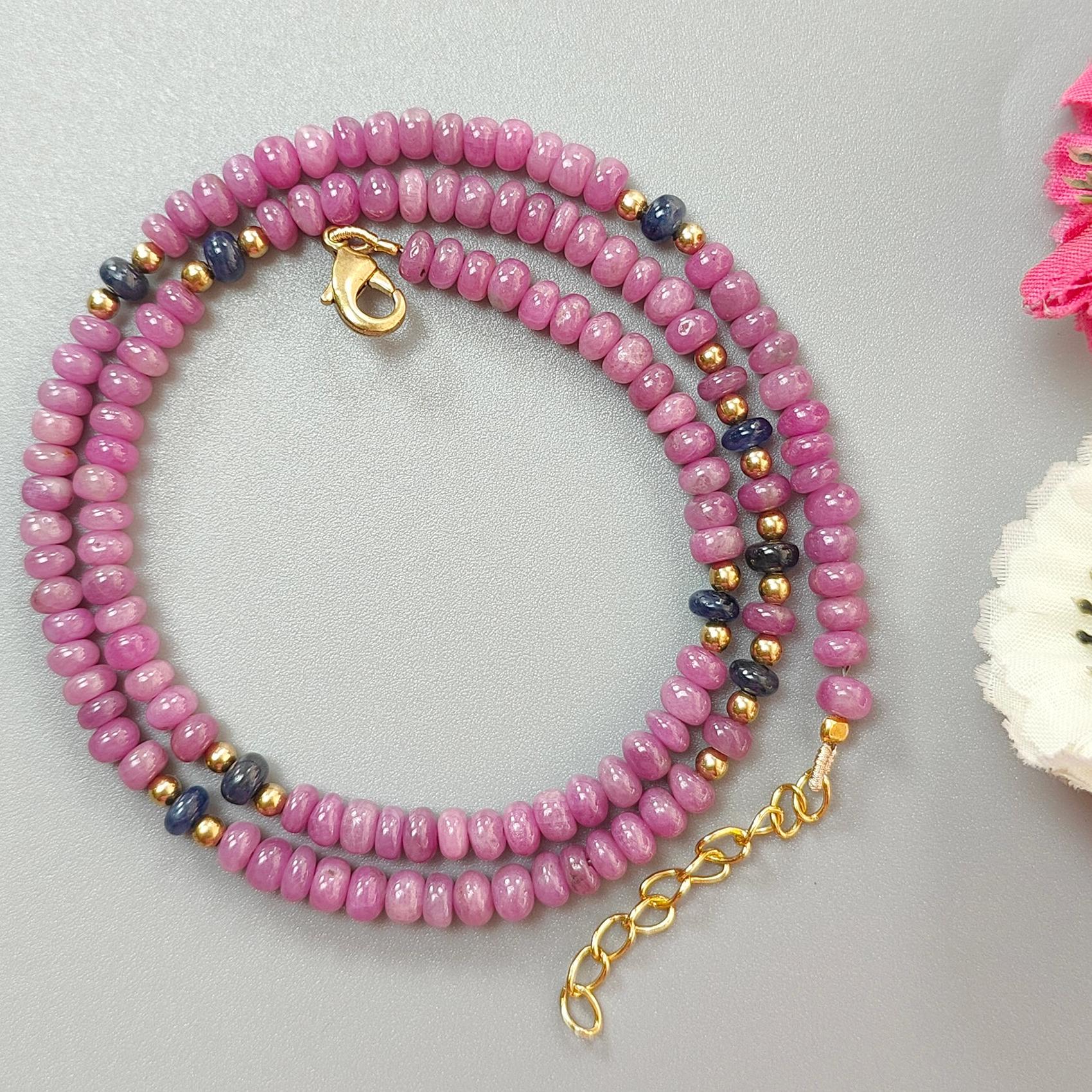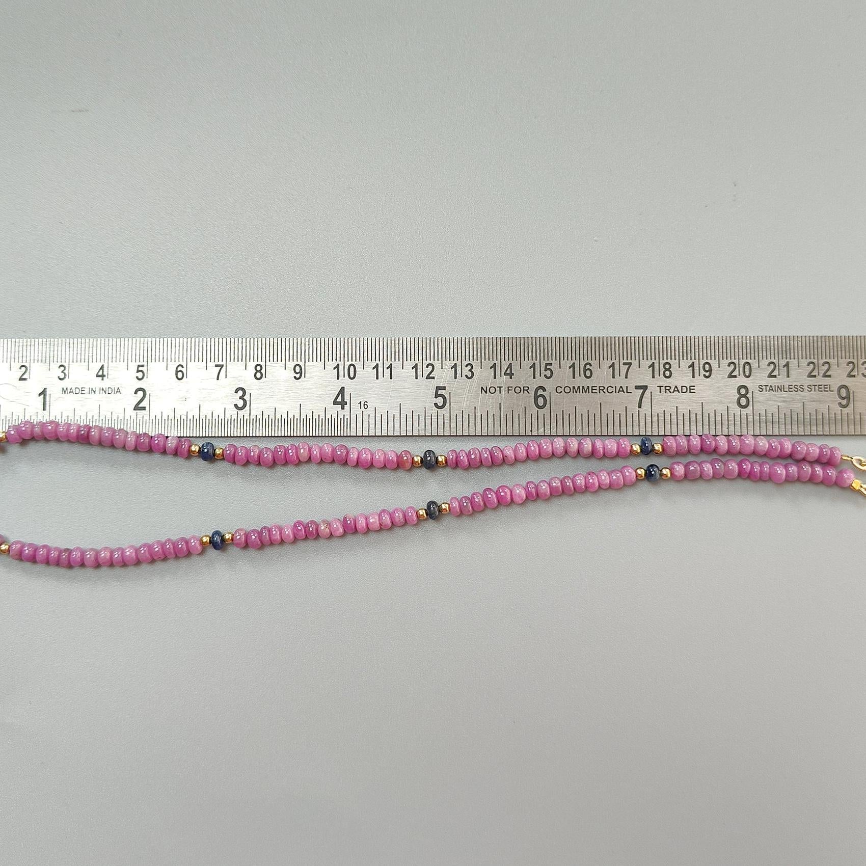 Ruby Gemstone Beads Necklace: 23gms Natural Untreated Ruby, Blue Sapphire Plain Rondelle Brass Necklace 4.5mm - 5mm 18"