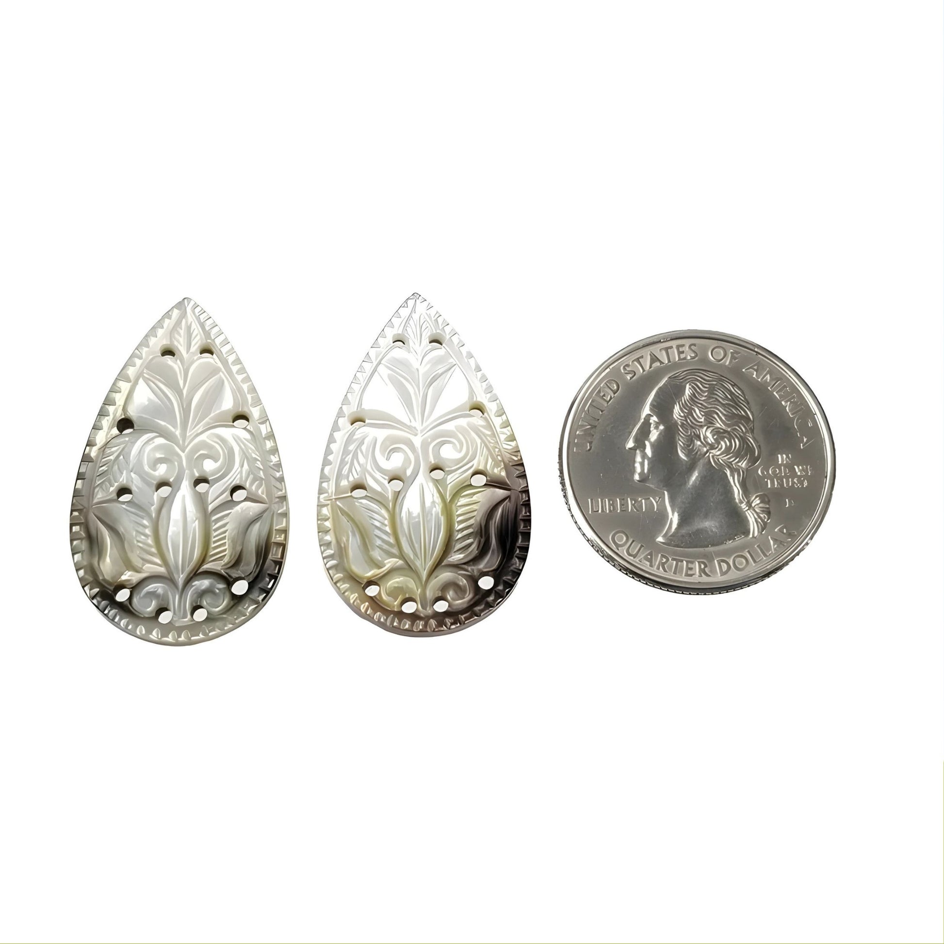 31.85cts Mother Of Pearl Gemstone Carving Natural Untreated White Pear Shape 30.5mm pair
