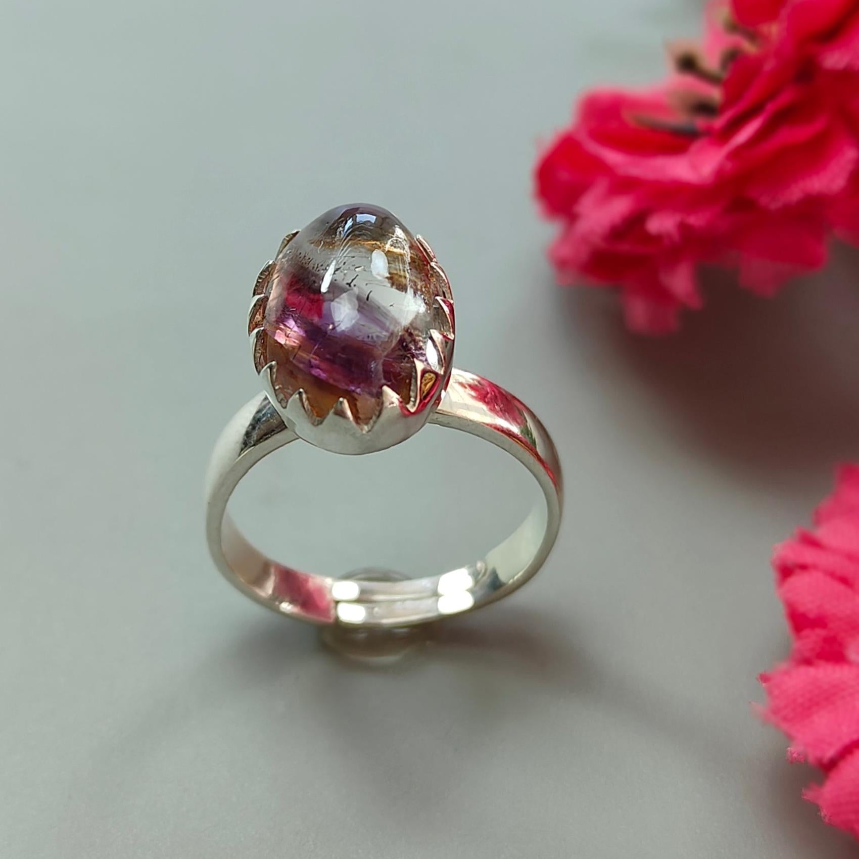 Amethyst Plain Silver Ring: 4.39gms Natural Untreated Super Seven Amethyst Oval Shape Plain 925 Sterling Silver Bezel Set Adjustable Ring