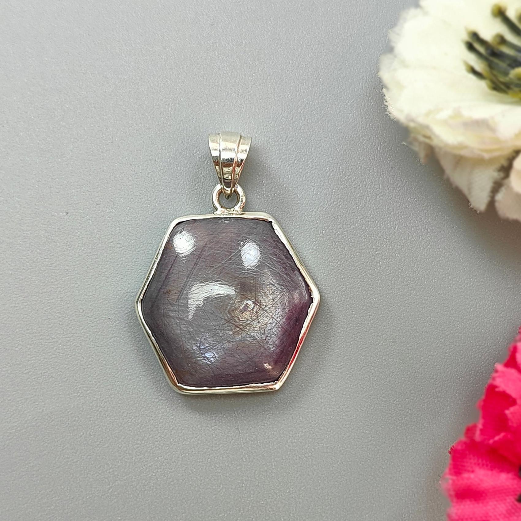 Star Ruby Silver Pendant: 5.47gms Natural Untreated Star Ruby Hexagon Shape Cabochon 925 Sterling Silver Bezel Set Pendant 1.30"
