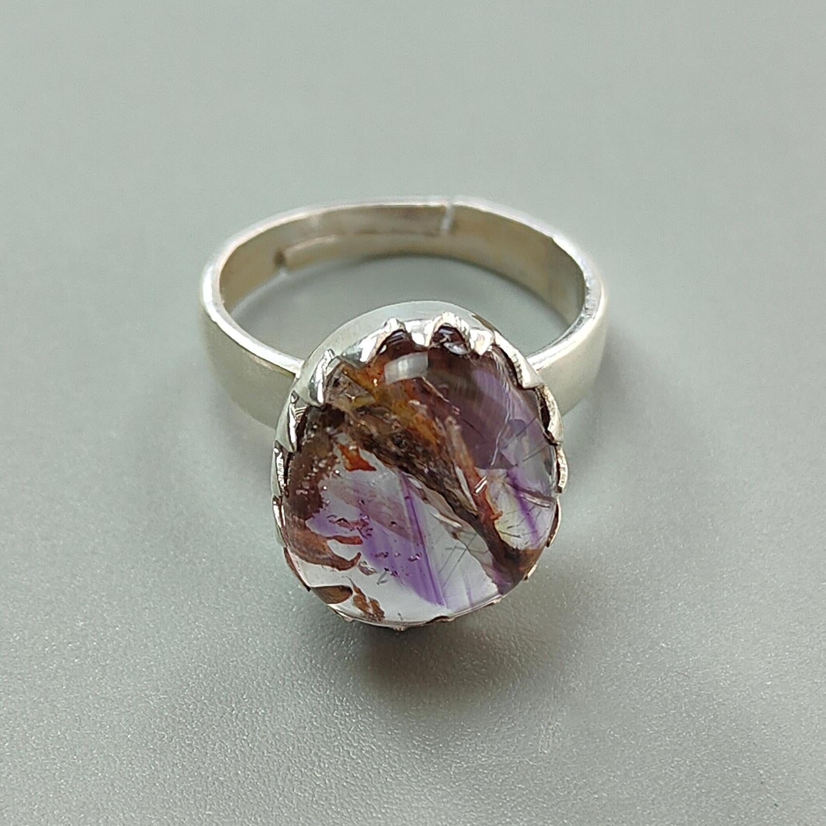 Amethyst Plain Silver Ring: 5.52gms Natural Untreated Super Seven Amethyst Fancy Shape Plain 925 Sterling Silver Bezel Set Adjustable Ring