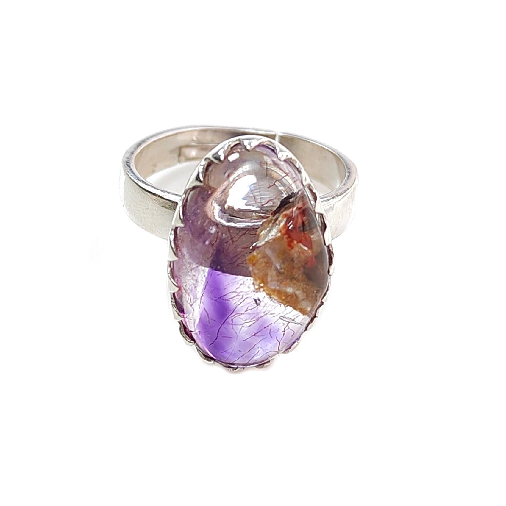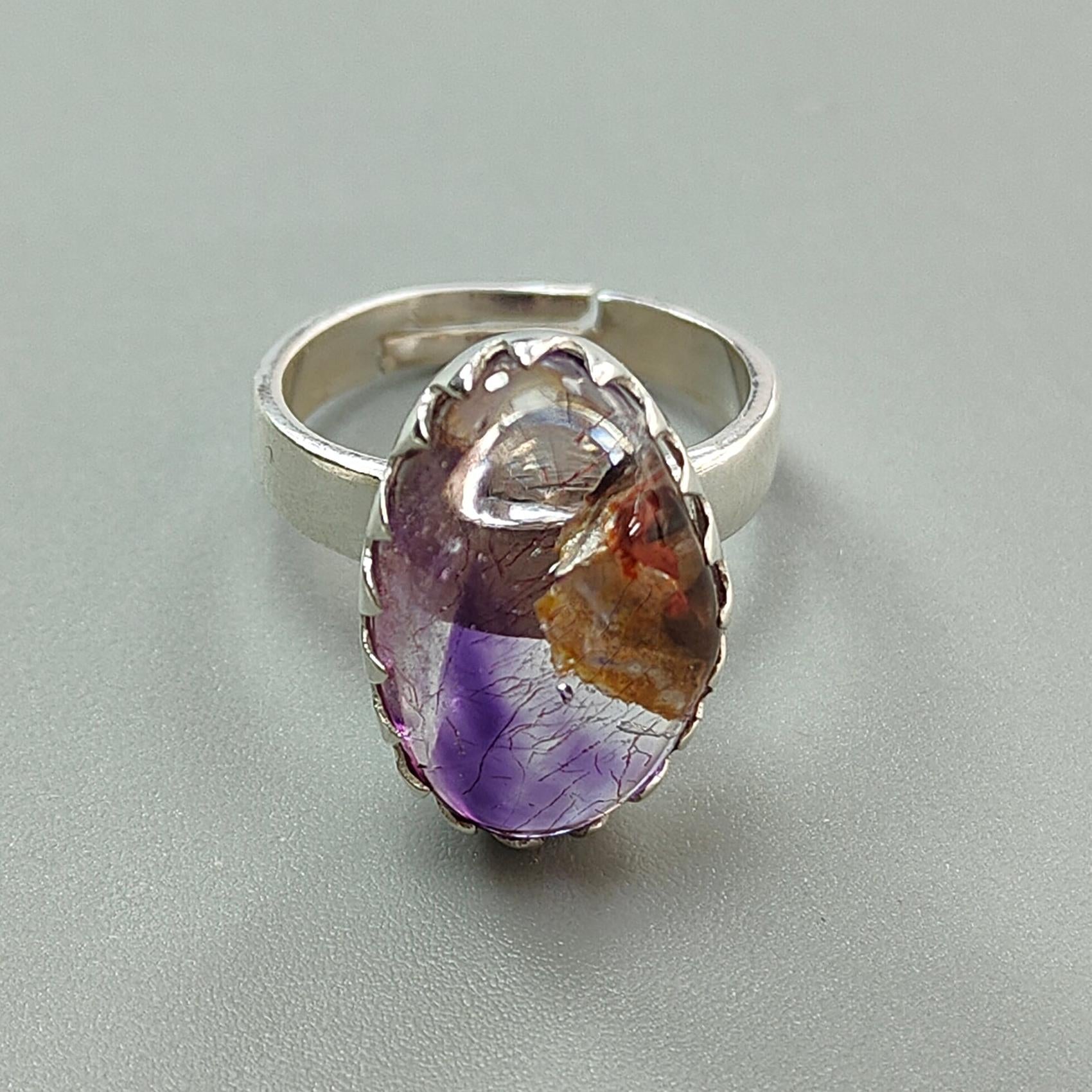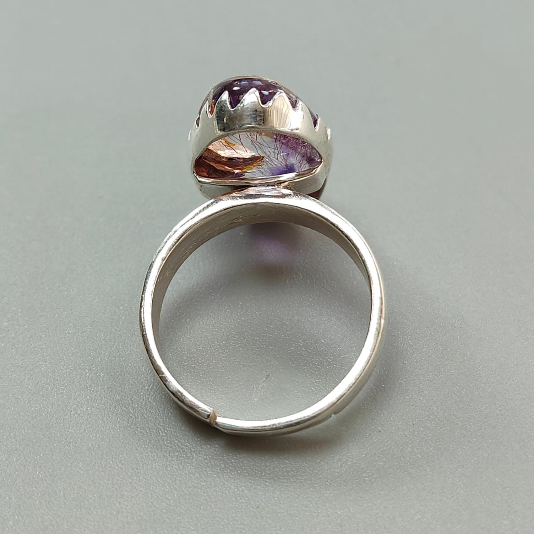 Amethyst Plain Silver Ring: 5.62gms Natural Untreated Super Seven Amethyst Fancy Shape Plain 925 Sterling Silver Bezel Set Adjustable Ring