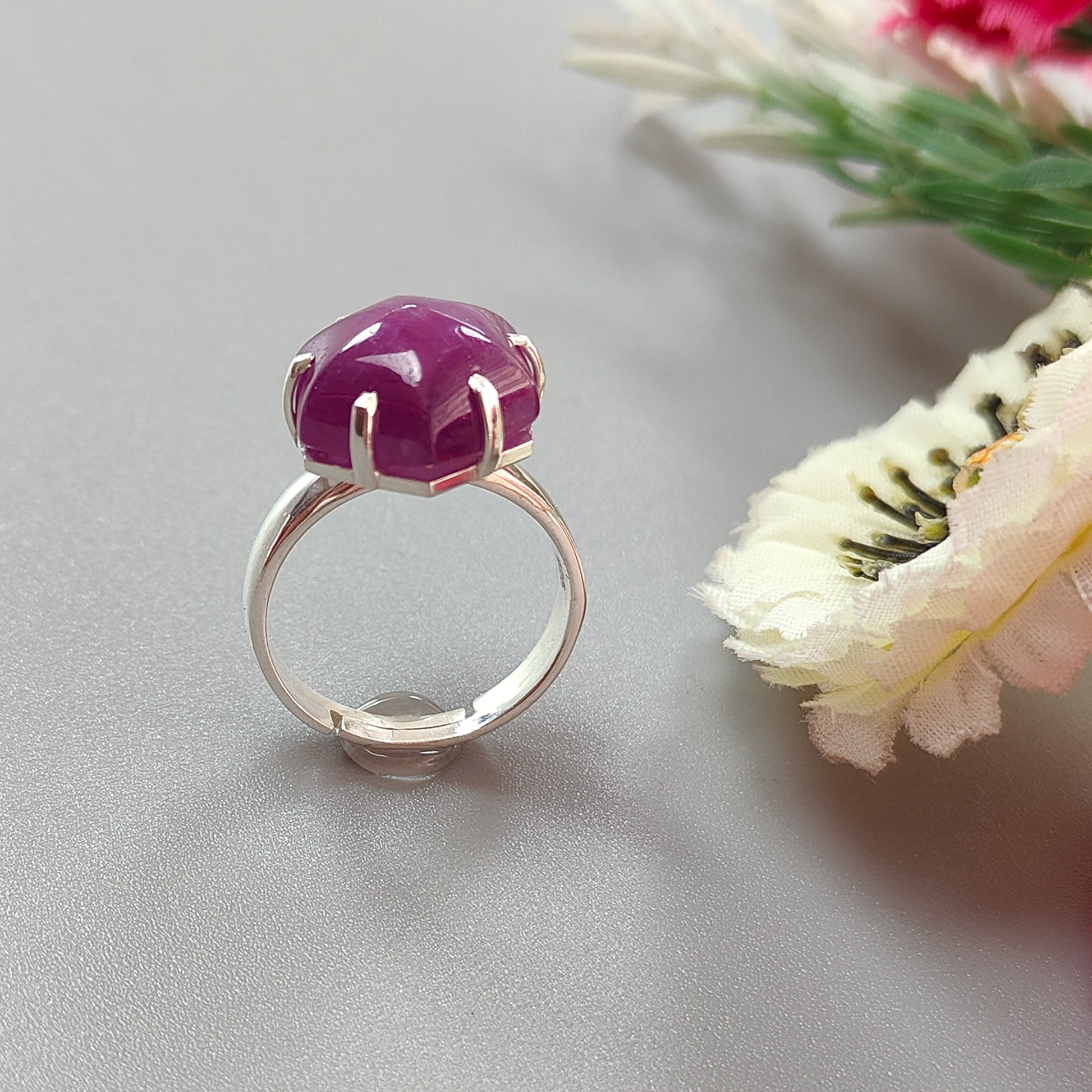 Ruby Cabochon Sugar Loaf Ring: 6.51gms Natural Untreated Sheen Ruby Cabochon 925 Sterling Silver Prong Set Adjustable Ring