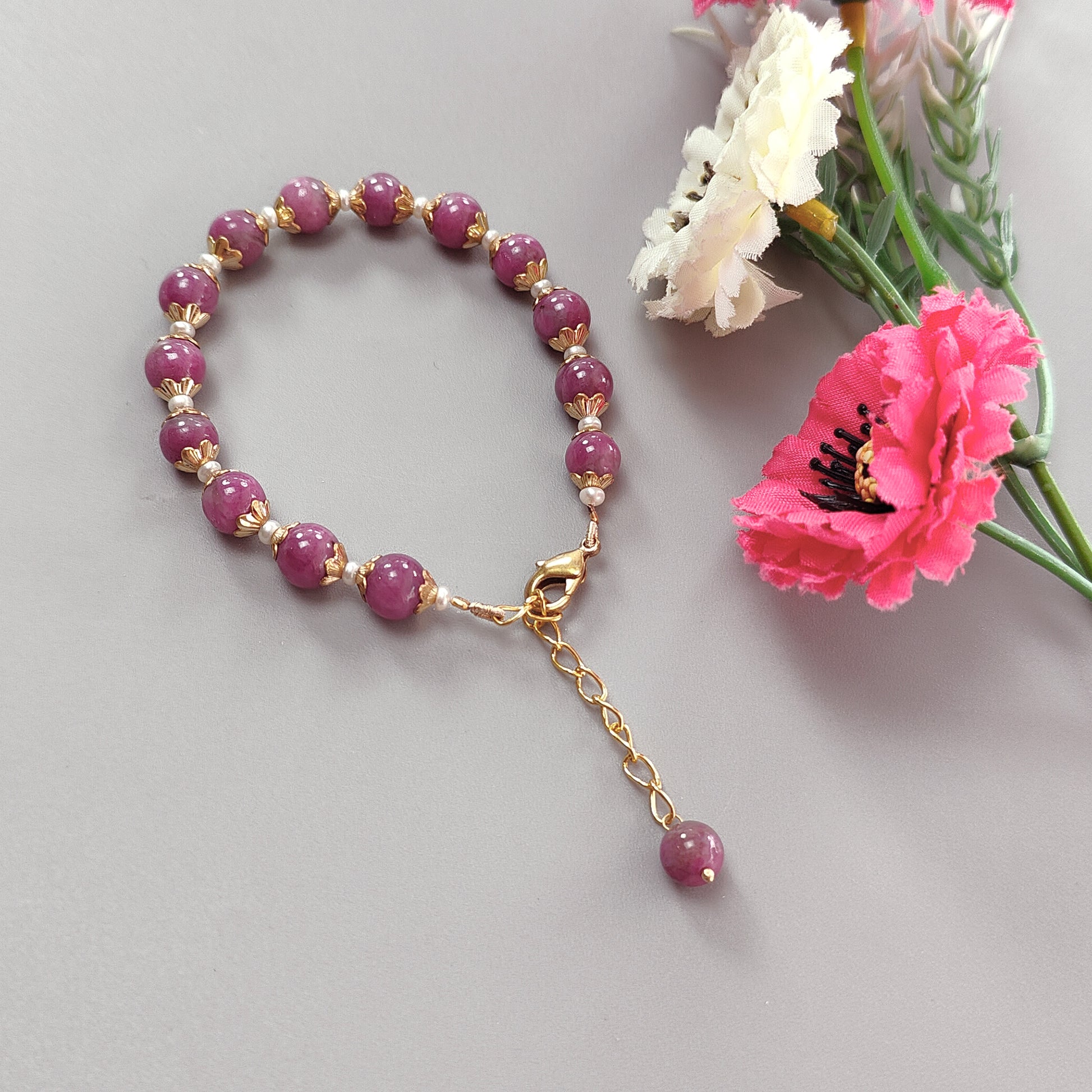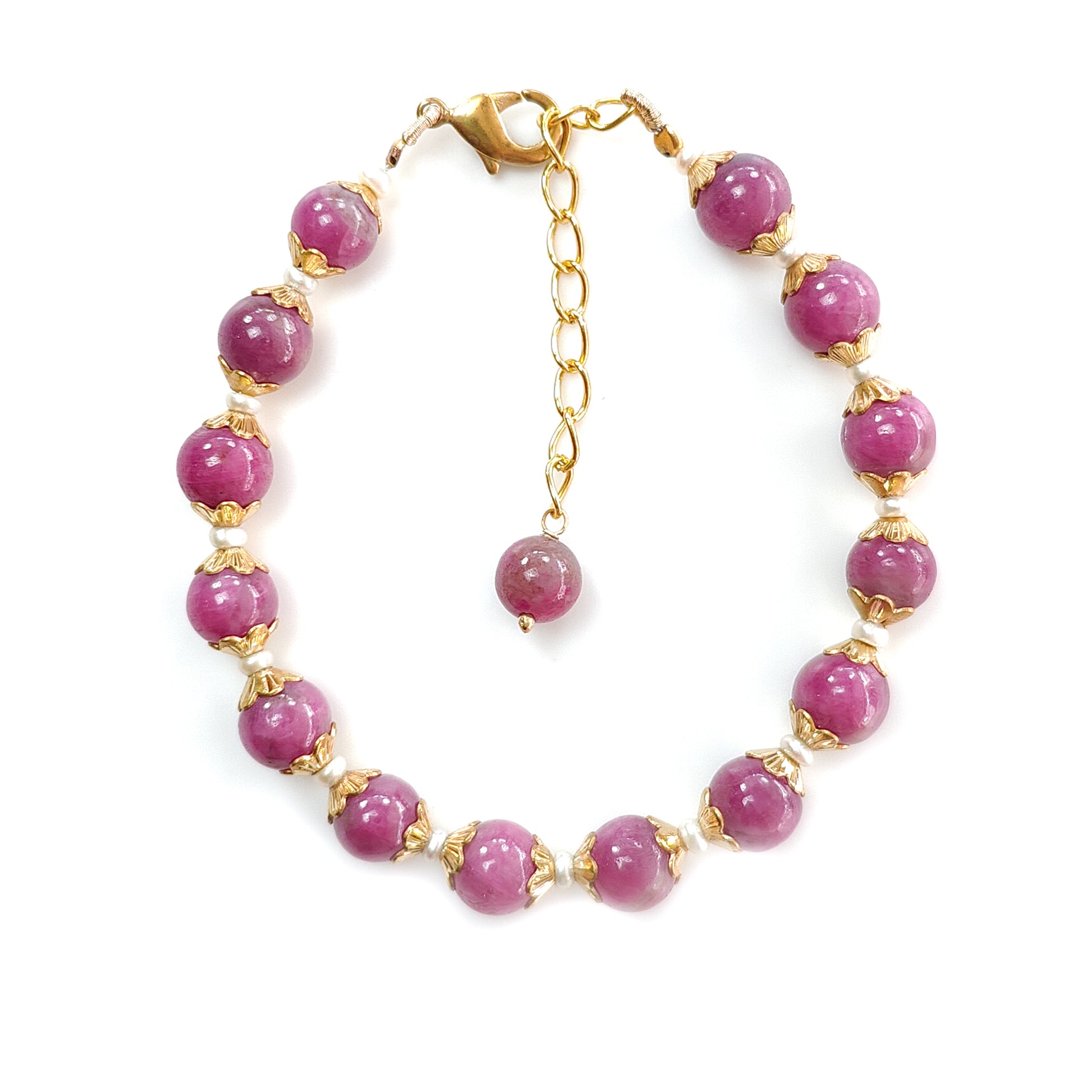 Zoisite Ruby & White Pearl Beads Bracelet: 74.60cts Natural Untreated Zoisite Ruby Round Plain Brass Bracelet 3mm - 7.5mm 6"