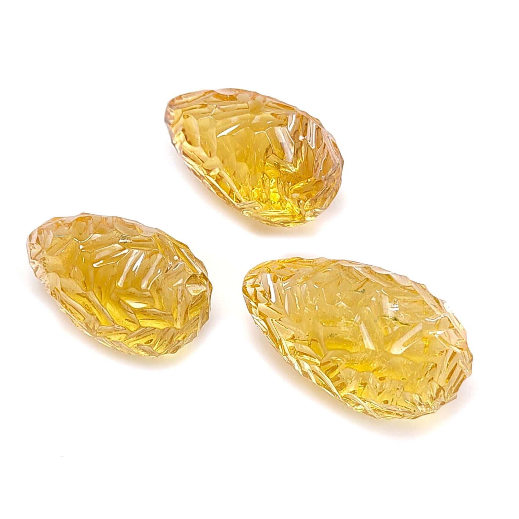 Citrine Gemstone Carving: 89.00cts Natural Untreated Yellow Citrine Hand Carved Teardrops Shape 22mm - 26mm 3pcs Set November Birthstone