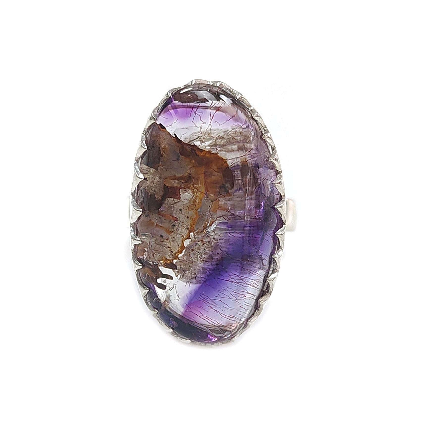 Amethyst Plain Silver Ring: 9.92gms Natural Untreated Super Seven Amethyst Oval Shape Plain 925 Sterling Silver Bezel Set Adjustable Ring