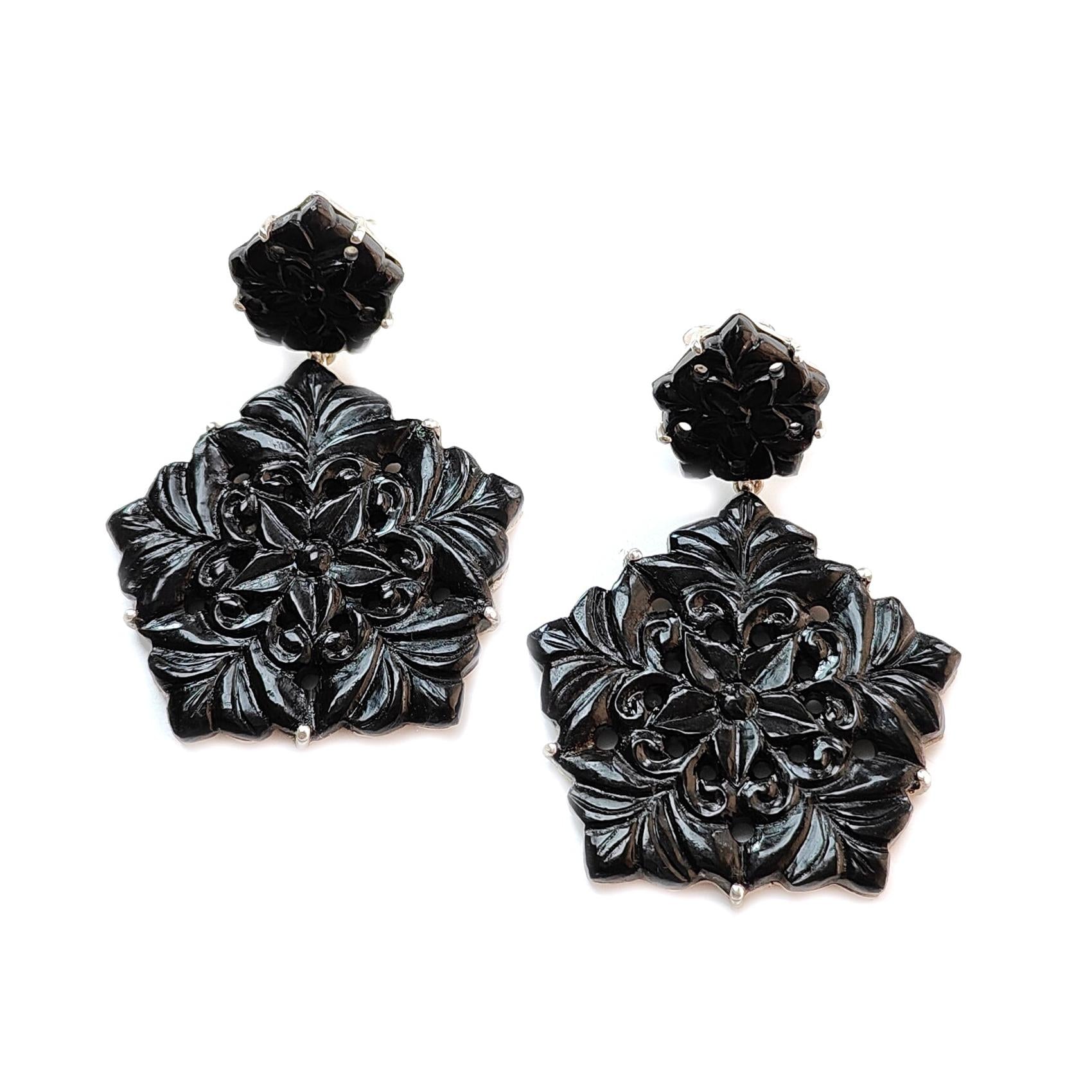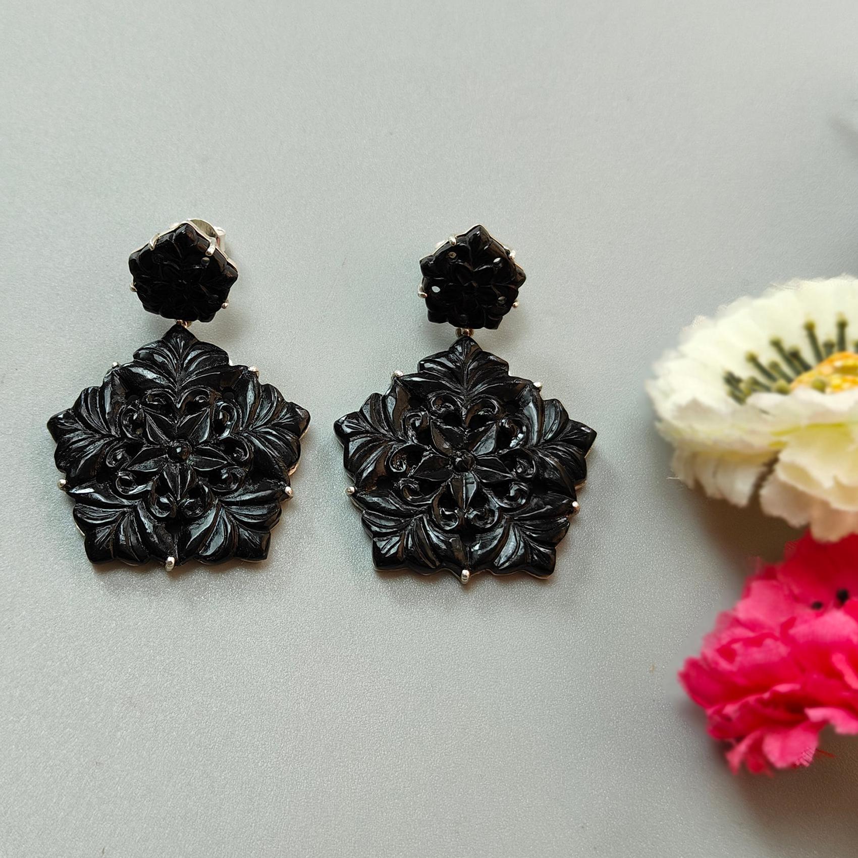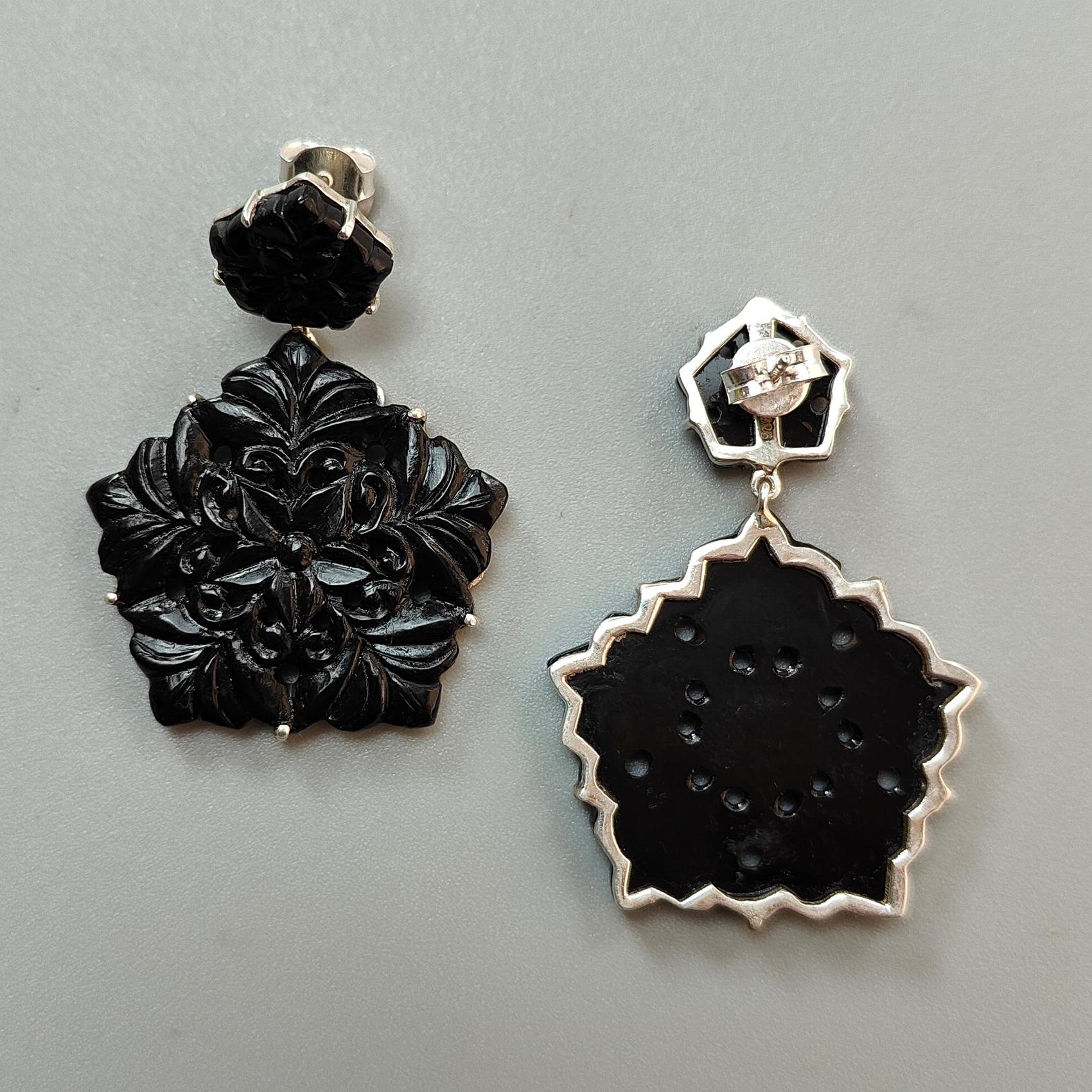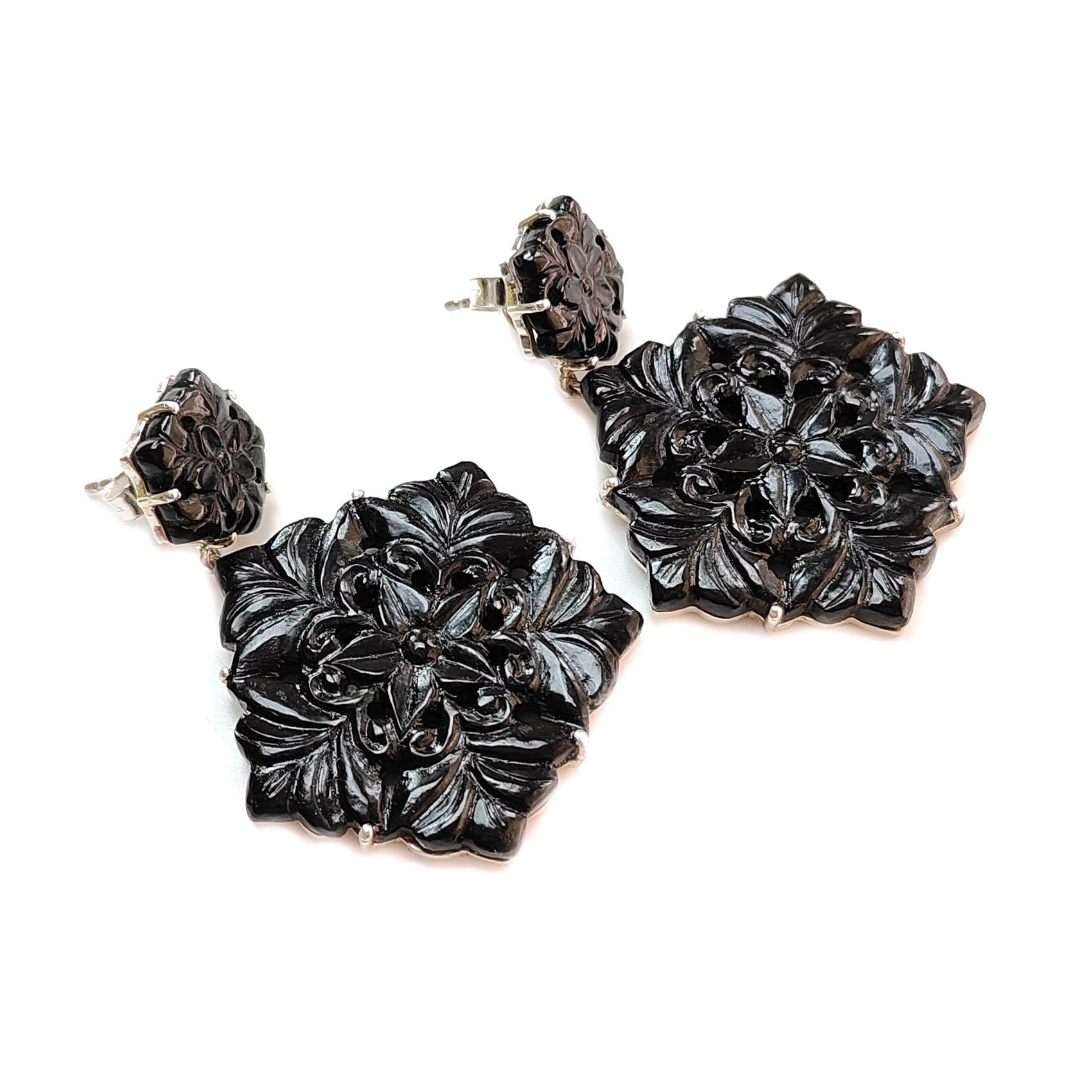 Black Onyx Carving Silver Earring: 14.82gms Natural Onyx Hand Carved Hexagon Shape 925 Sterling Silver Prong Set Push Back Stud Earring 2"