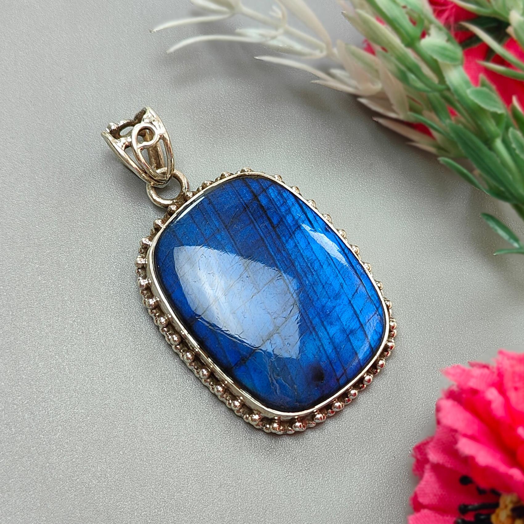 Blue Labradorite Plain Silver Pendant: 19.58gms Natural Untreated Labradorite Cushion Shape 925 Sterling Silver Bezel Set Pendant 2"
