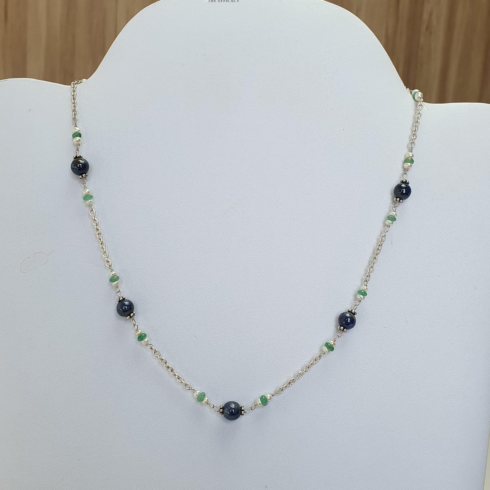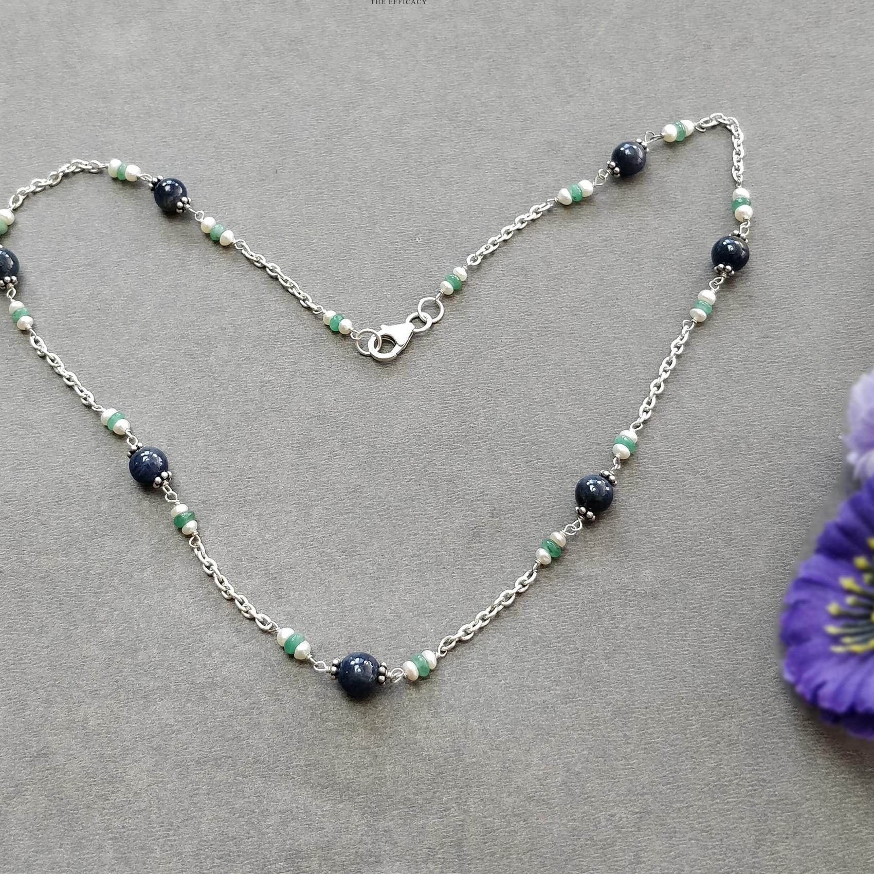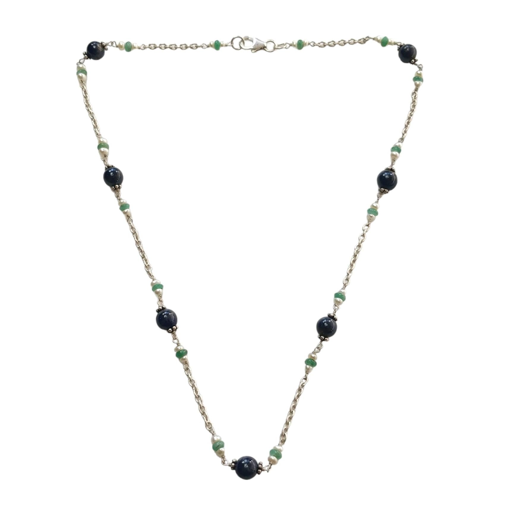 Blue Sapphire Green Emerald And White Pearl Natural Gemstones Round Beads 925 Sterling Silver 10.26gms NECKLACE Chain 18"
