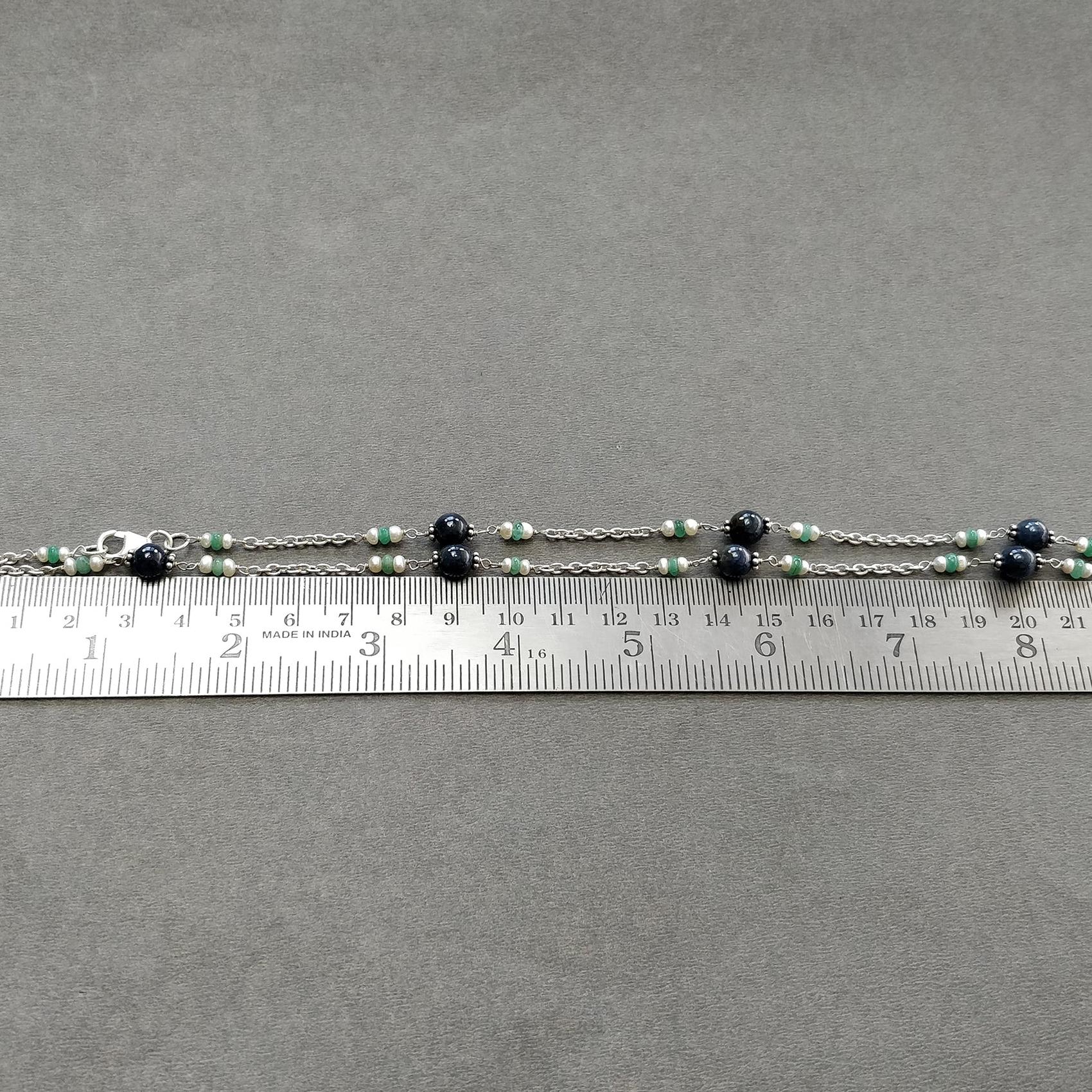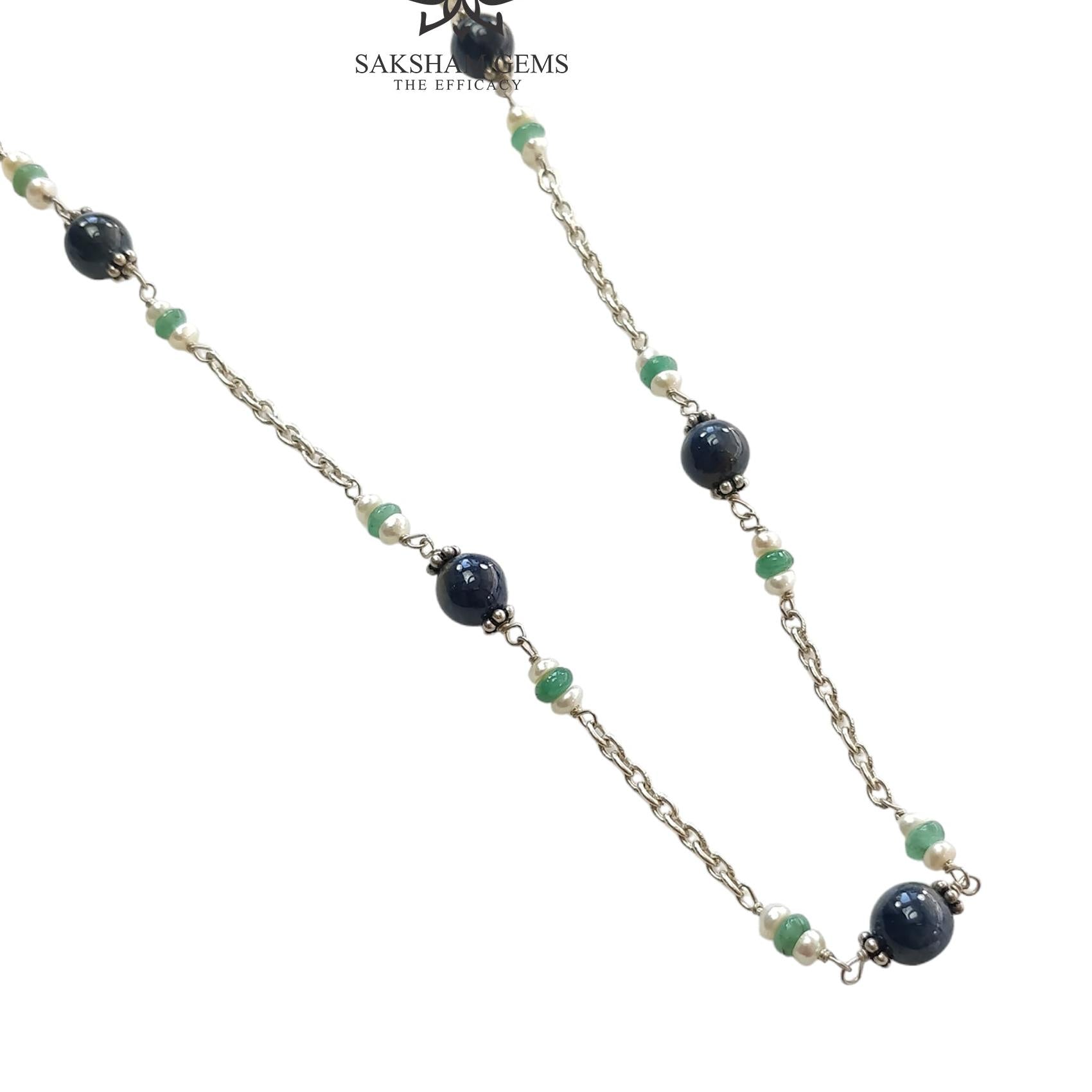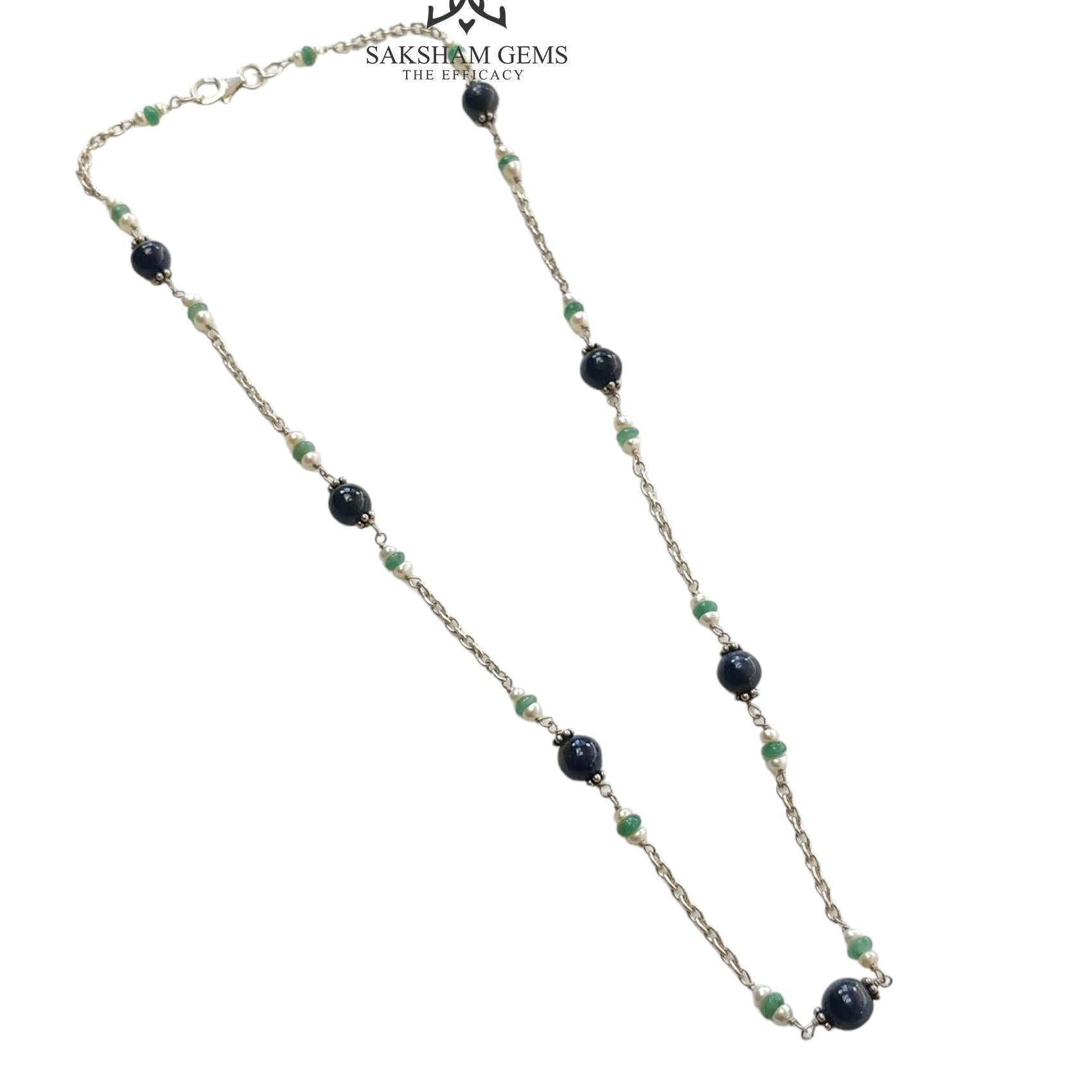 Blue Sapphire Green Emerald And White Pearl Natural Gemstones Round Beads 925 Sterling Silver 10.26gms NECKLACE Chain 18"