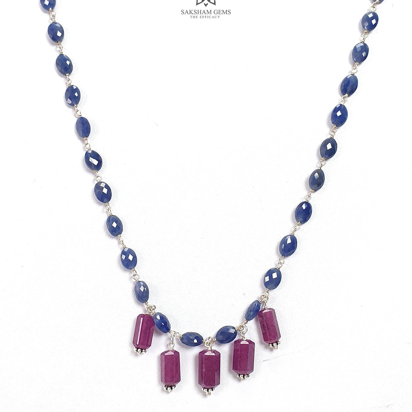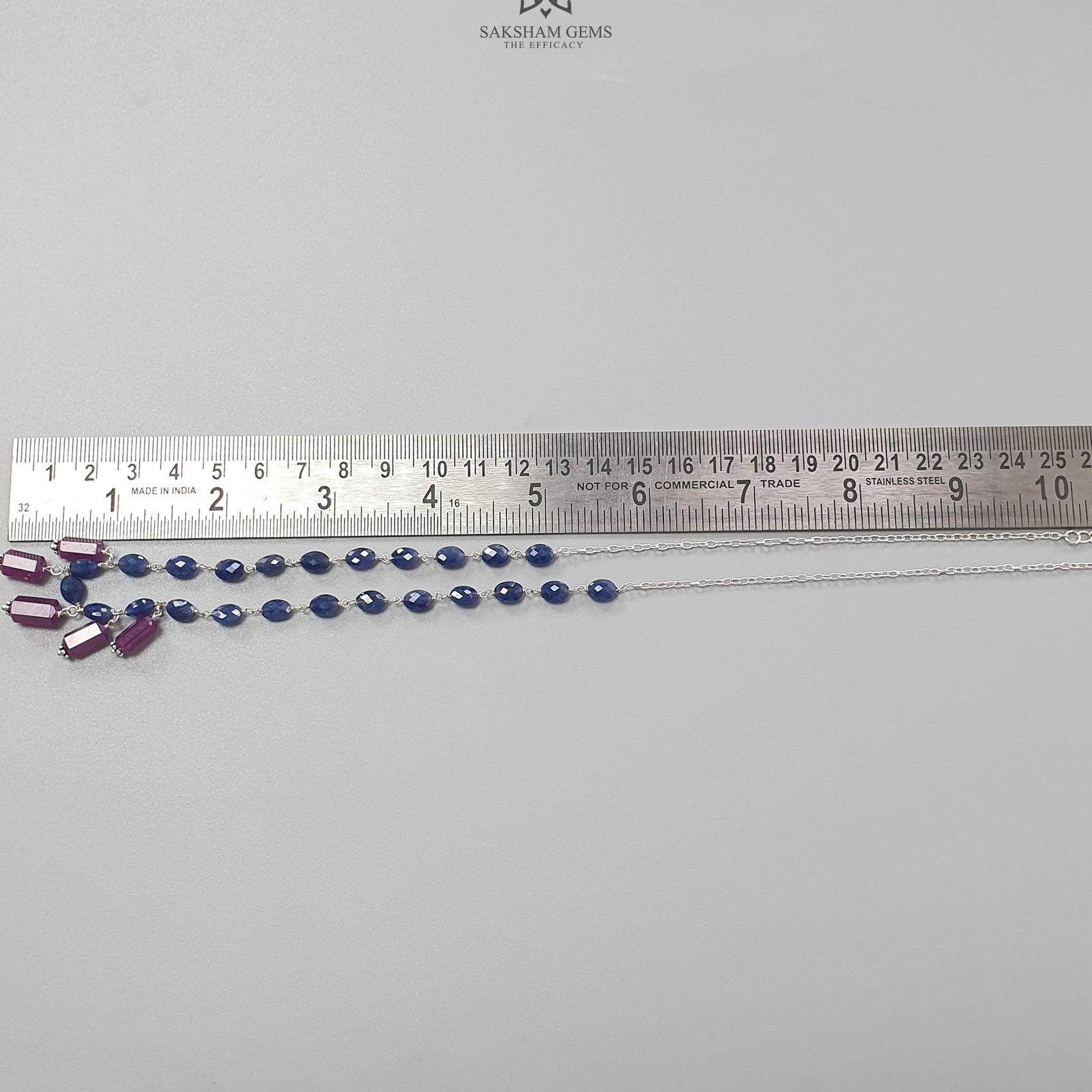 Blue Sapphire and Ruby Beads Chain Necklace: 64.65cts Natural Sapphire Pencil Oval, Checker Cut Briolette 925 Silver Necklace 9mm - 10mm 22"