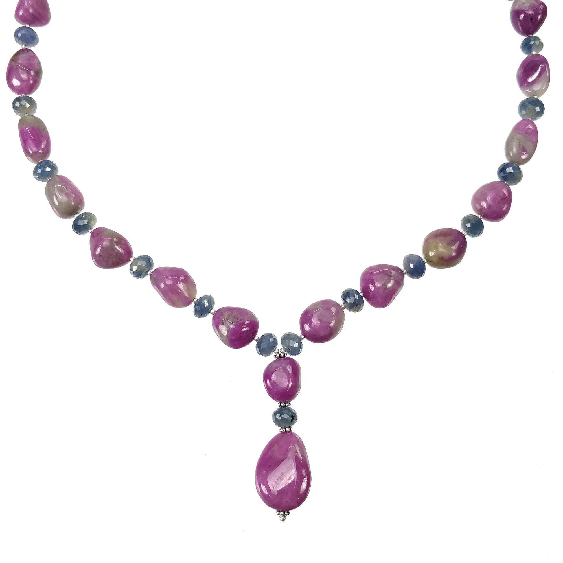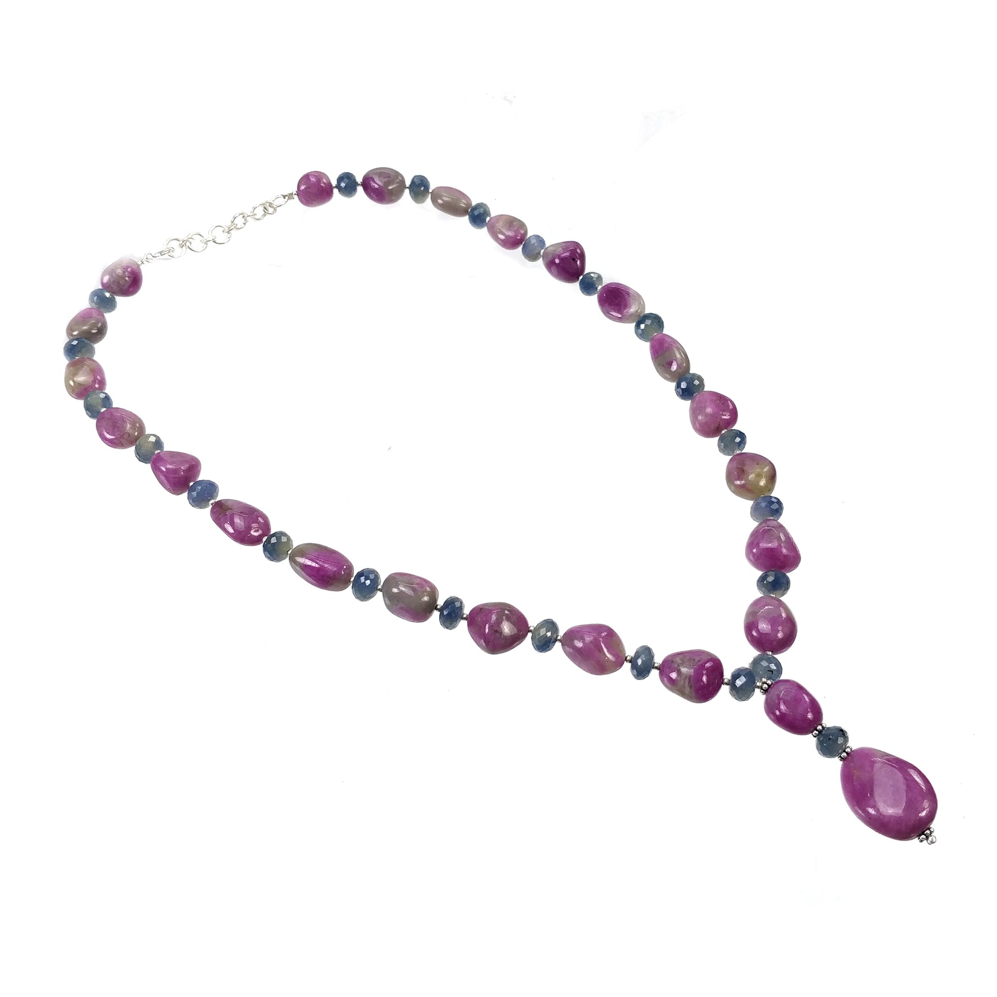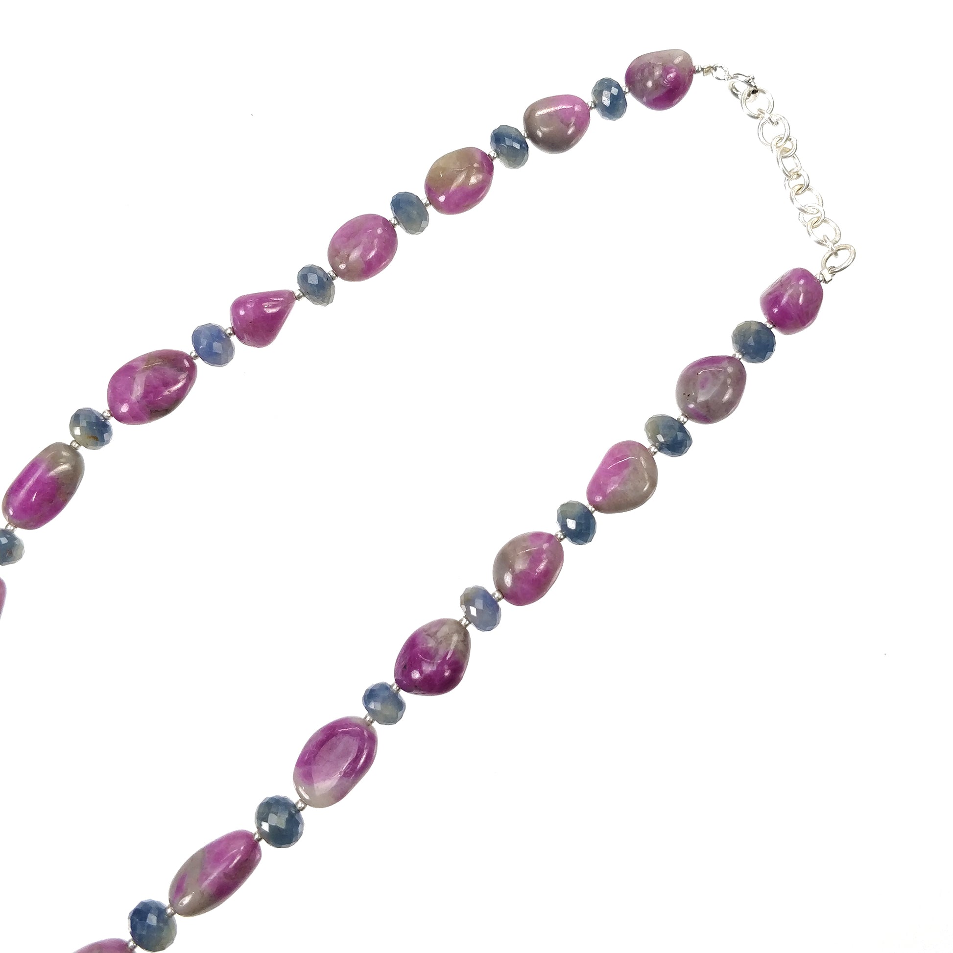 Ruby & Blue Sapphire Gemstone NECKLACE: 74.38gms Natural Untreated Bi-Color Zoisite Ruby 925 Sterling Silver 7mm - 21*16mm 19.5"