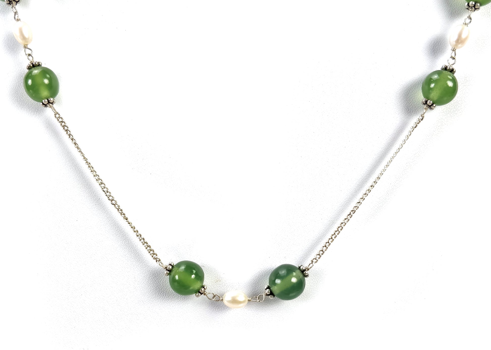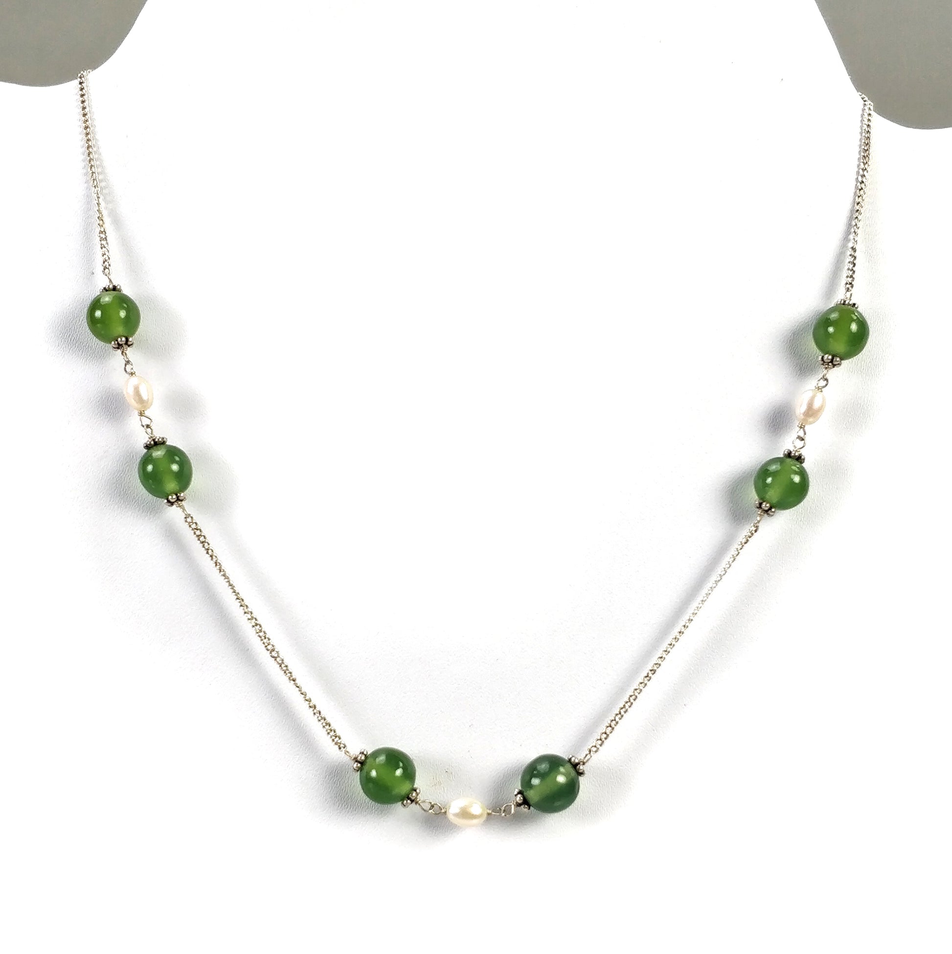 Green SERPENTINE & White PEARL Gemstones Beads Chain NECKLACE : 925 Sterling Silver Natural Serpentine Round Oval 16" Statement Necklace