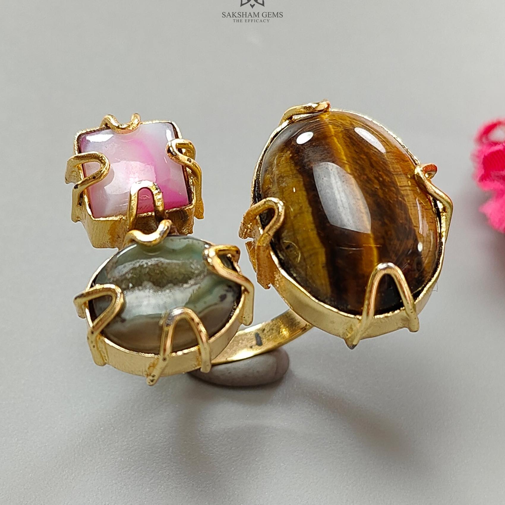 Handmade Cocktail Ring: 11.01gms Gold Plated Natural Multi Color Gemstone Boho Style Dainty Oval Shape Adjustable Ring Gift For Her