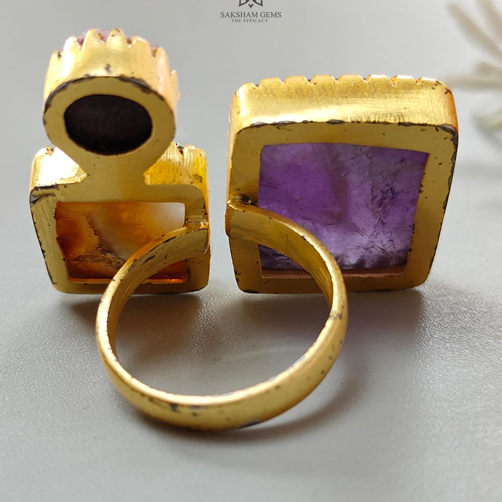 Handmade Cocktail Ring: 14.55gms Gold Plated Natural Multi Color Gemstone Boho Style Dainty Square Shape Adjustable Ring Gift For Her