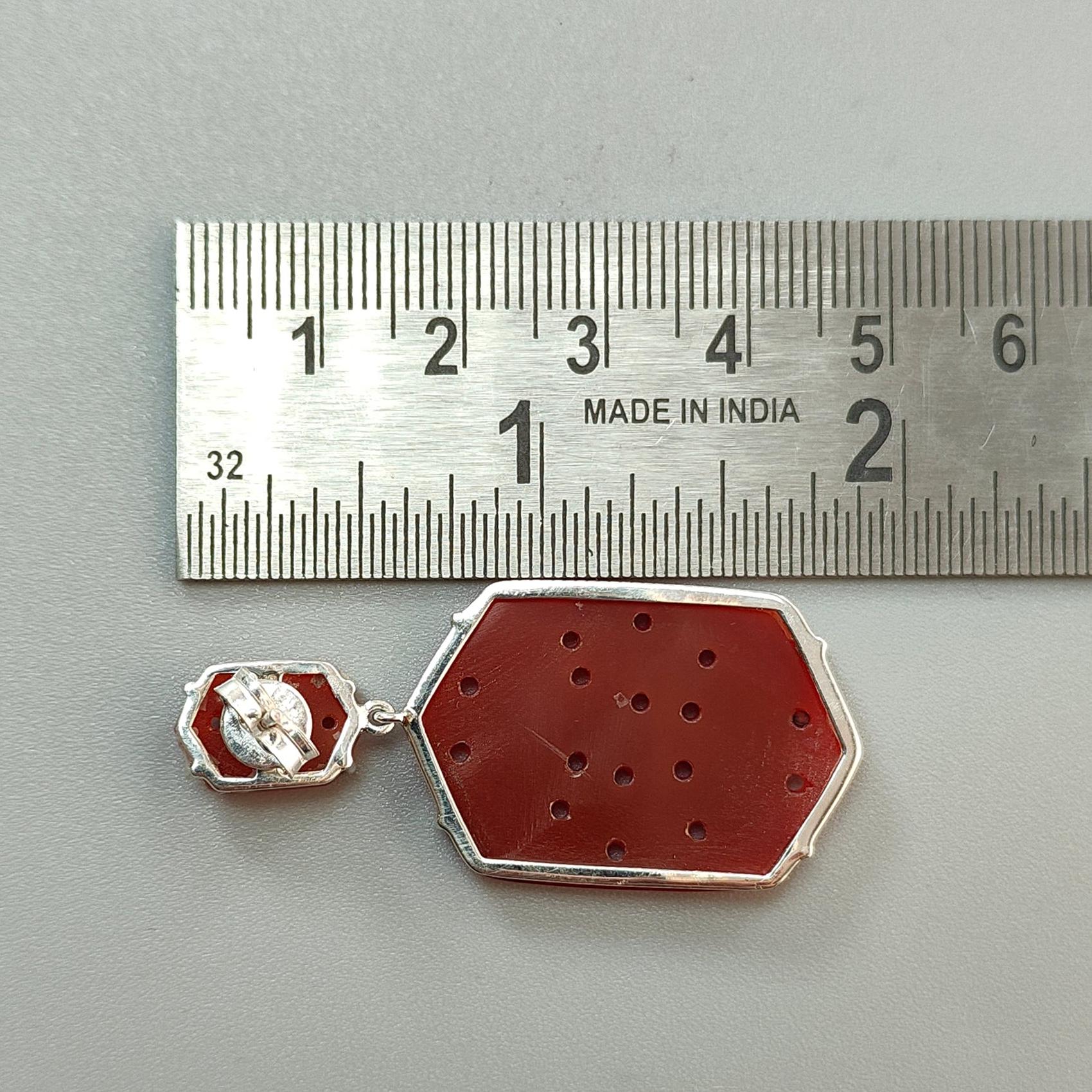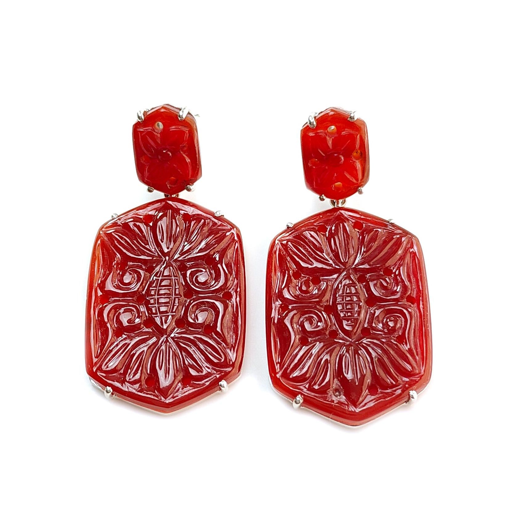 Orange Onyx Carving Silver Earring: 12.04gms Natural Onyx Hand Carved Hexagon Shape 925 Sterling Silver Prong Set Push Back Stud Earring 2"