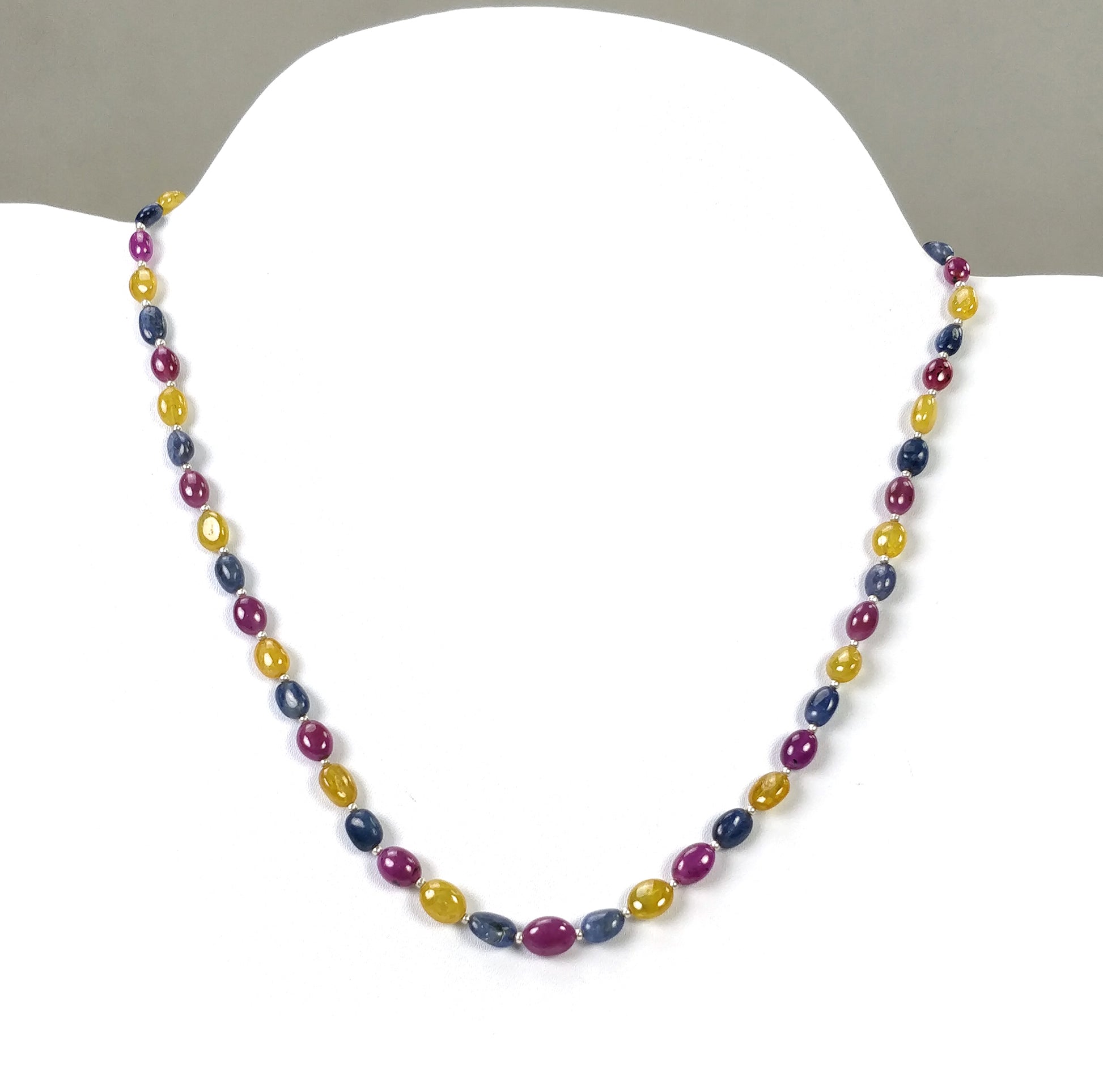 Yellow Blue SAPPHIRE & RUBY Gemstone NECKLACE : 16.15gms Natural Oval Plain Beads Sapphire With 925 Sterling Silver 5.5*4.5mm - 8*6.5mm 17"