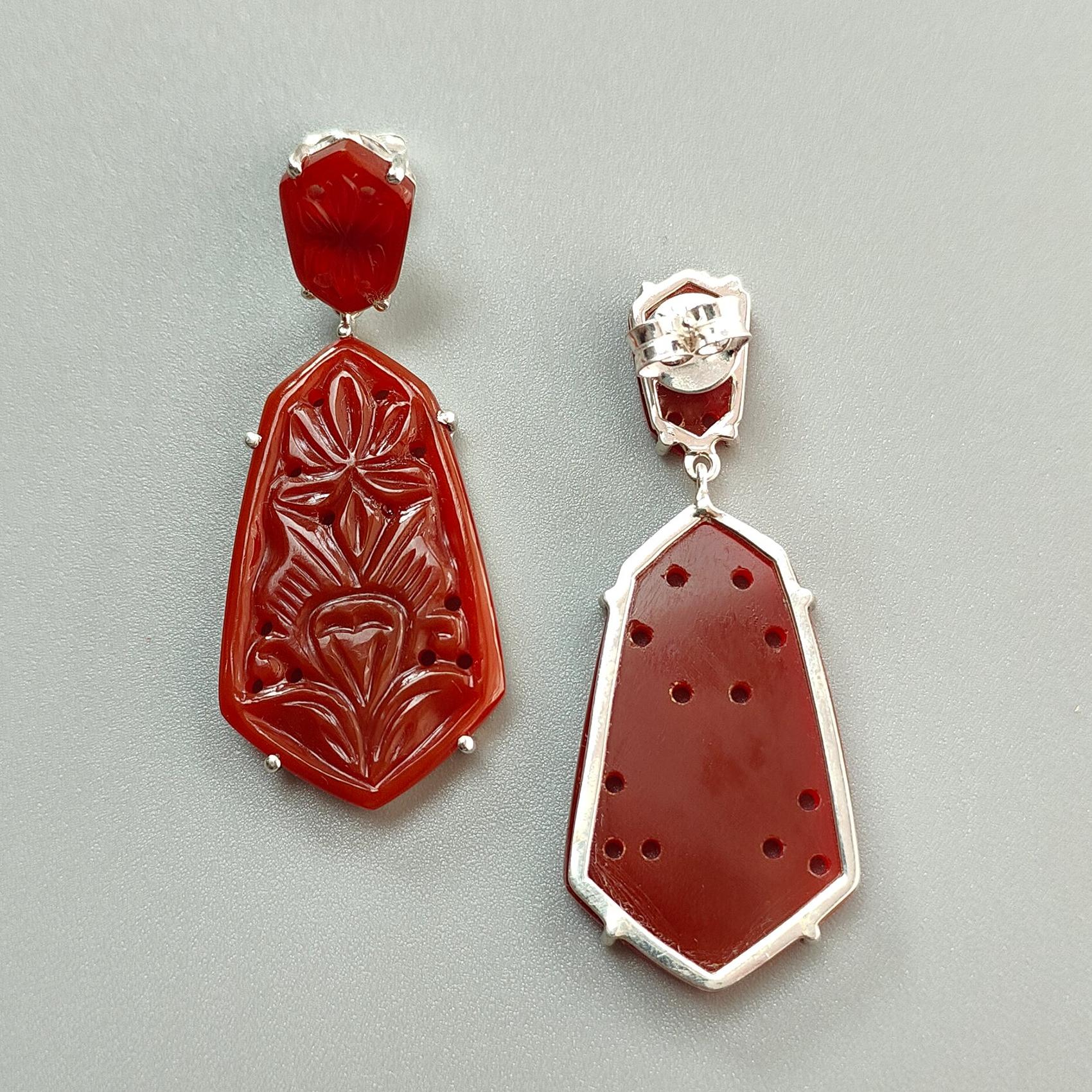 Orange Onyx Carving Silver Earring: 12.65gms Natural Onyx Hand Carved Fancy Shape 925 Sterling Silver Prong Set Push Back Stud Earring 2"
