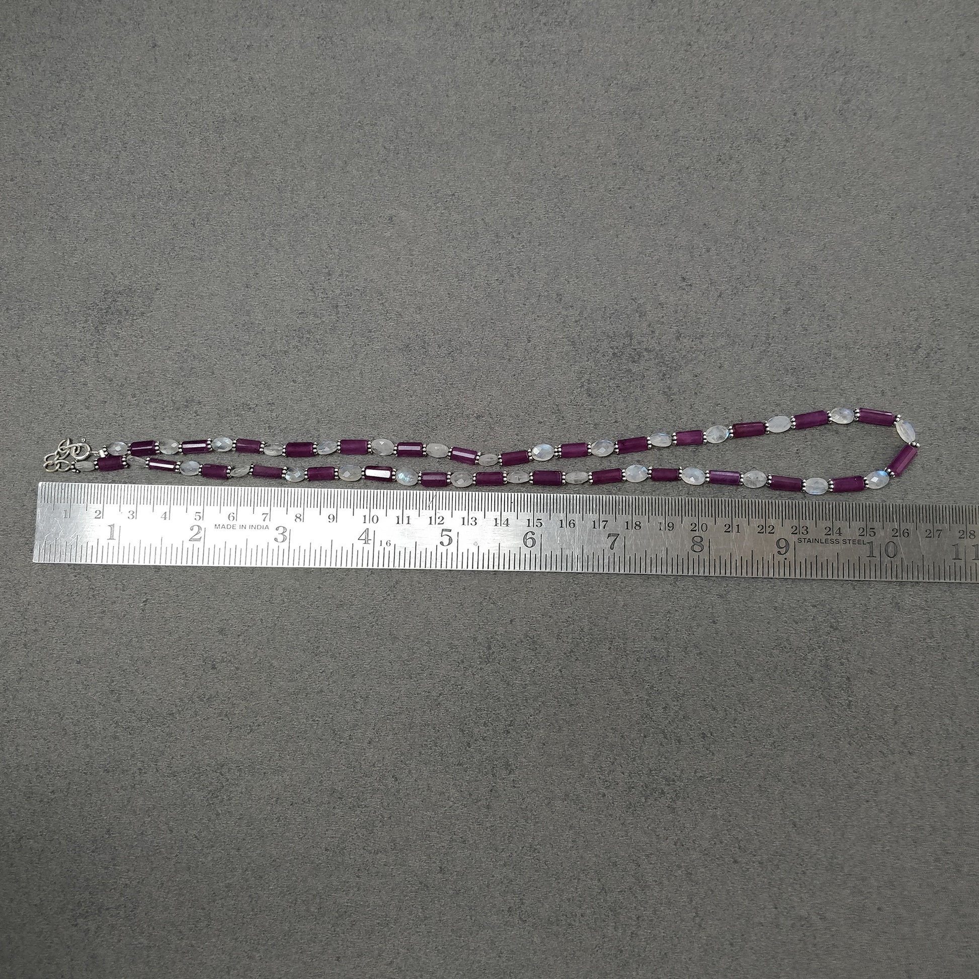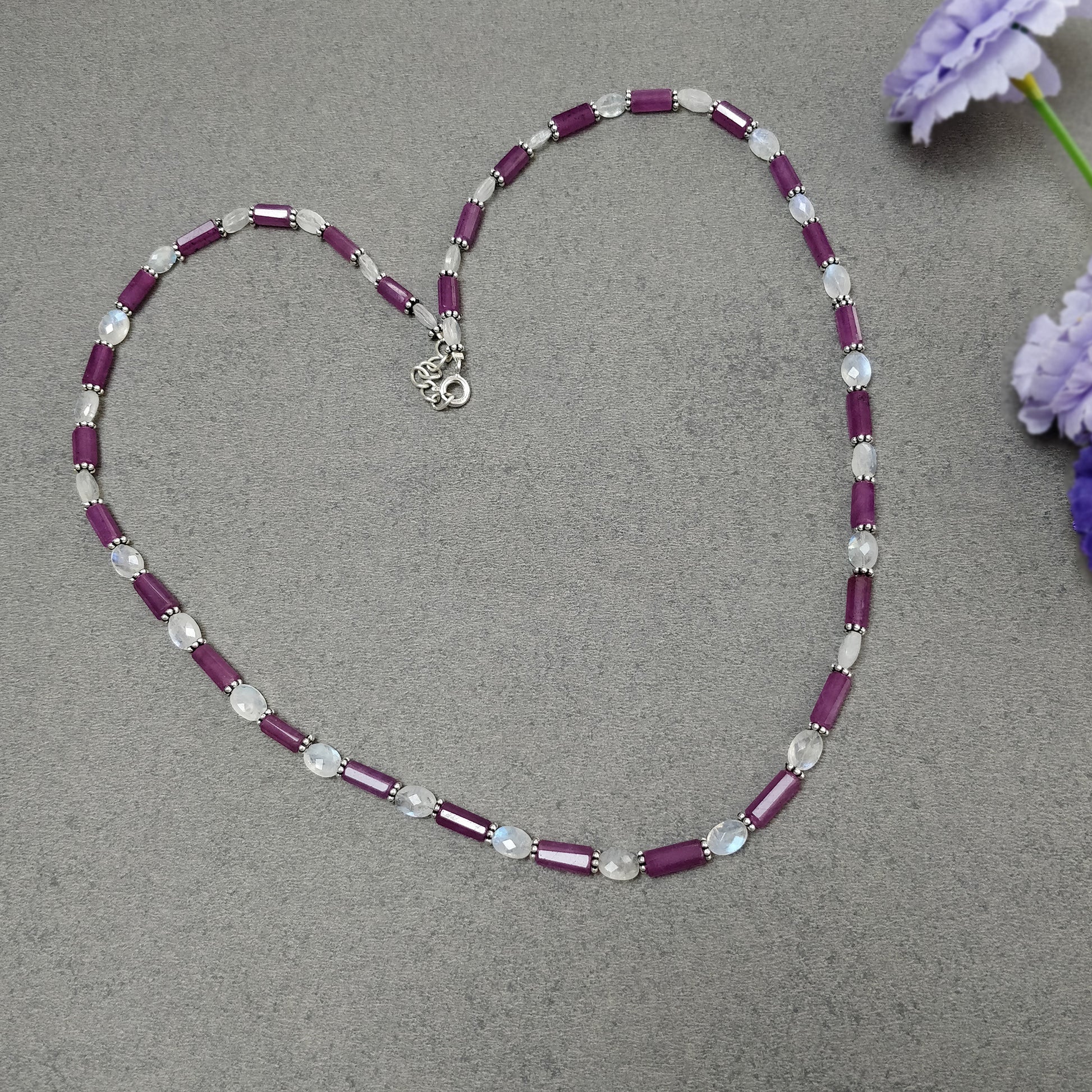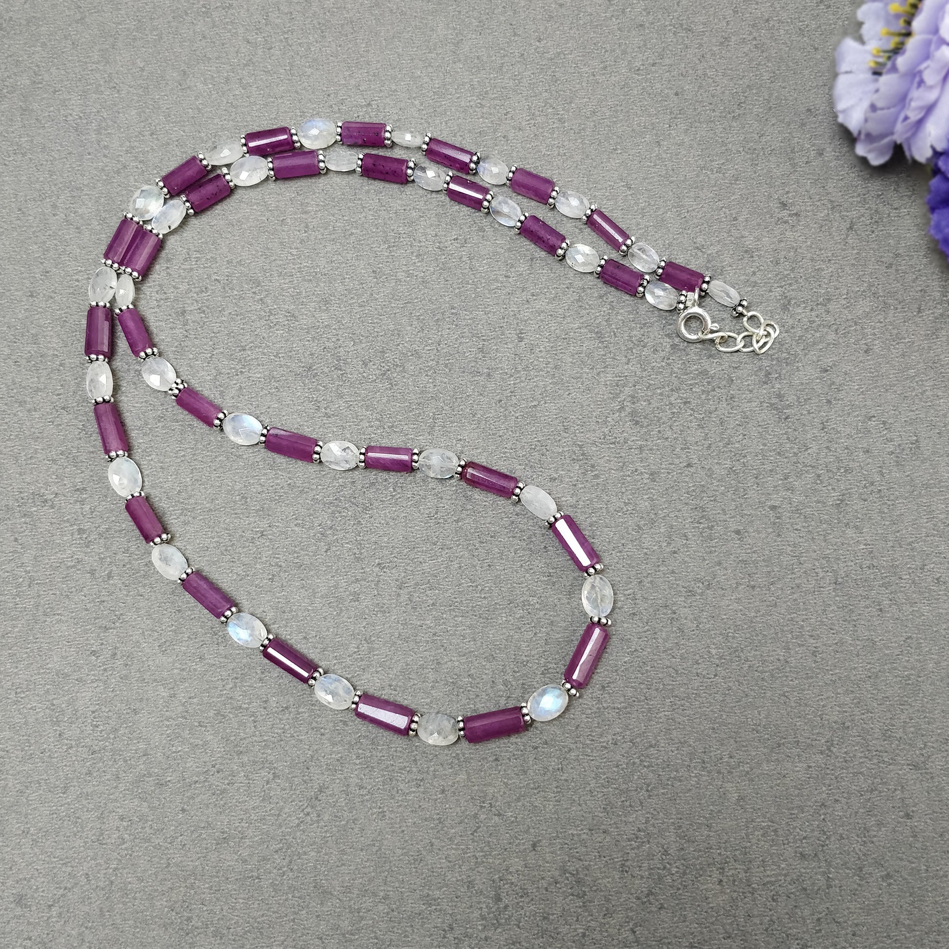 Raspberry Sapphire & Rainbow Moonstone Gemstone Fancy Cut NECKLACE: 105.00gms Natural Untreated Pencil 925 Sterling Silver 4.5mm - 11mm 20"