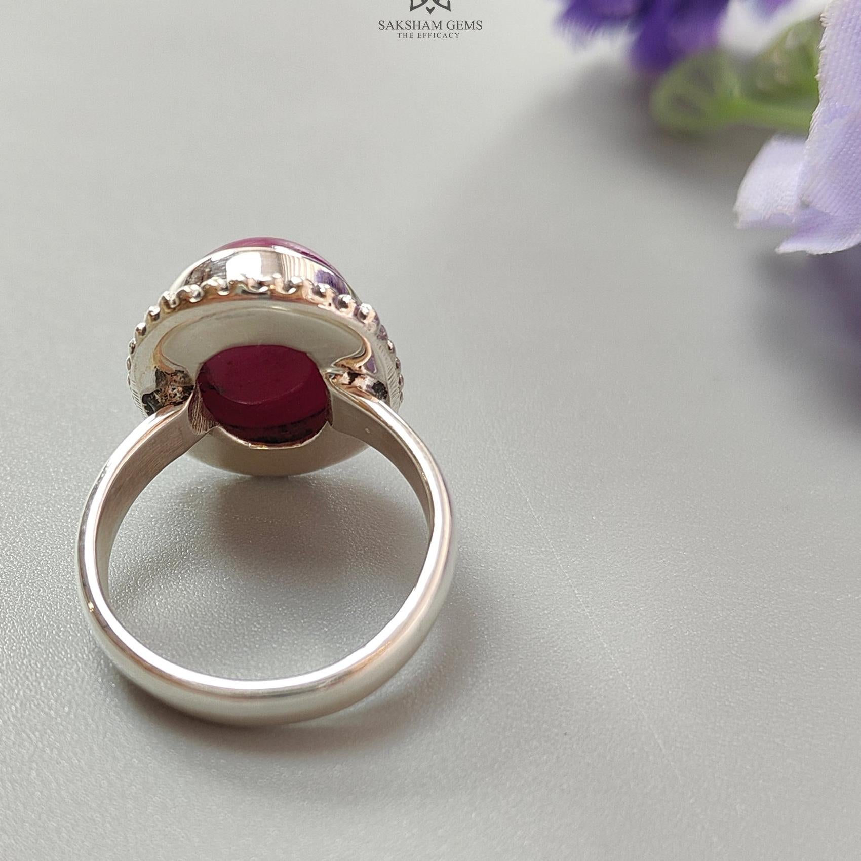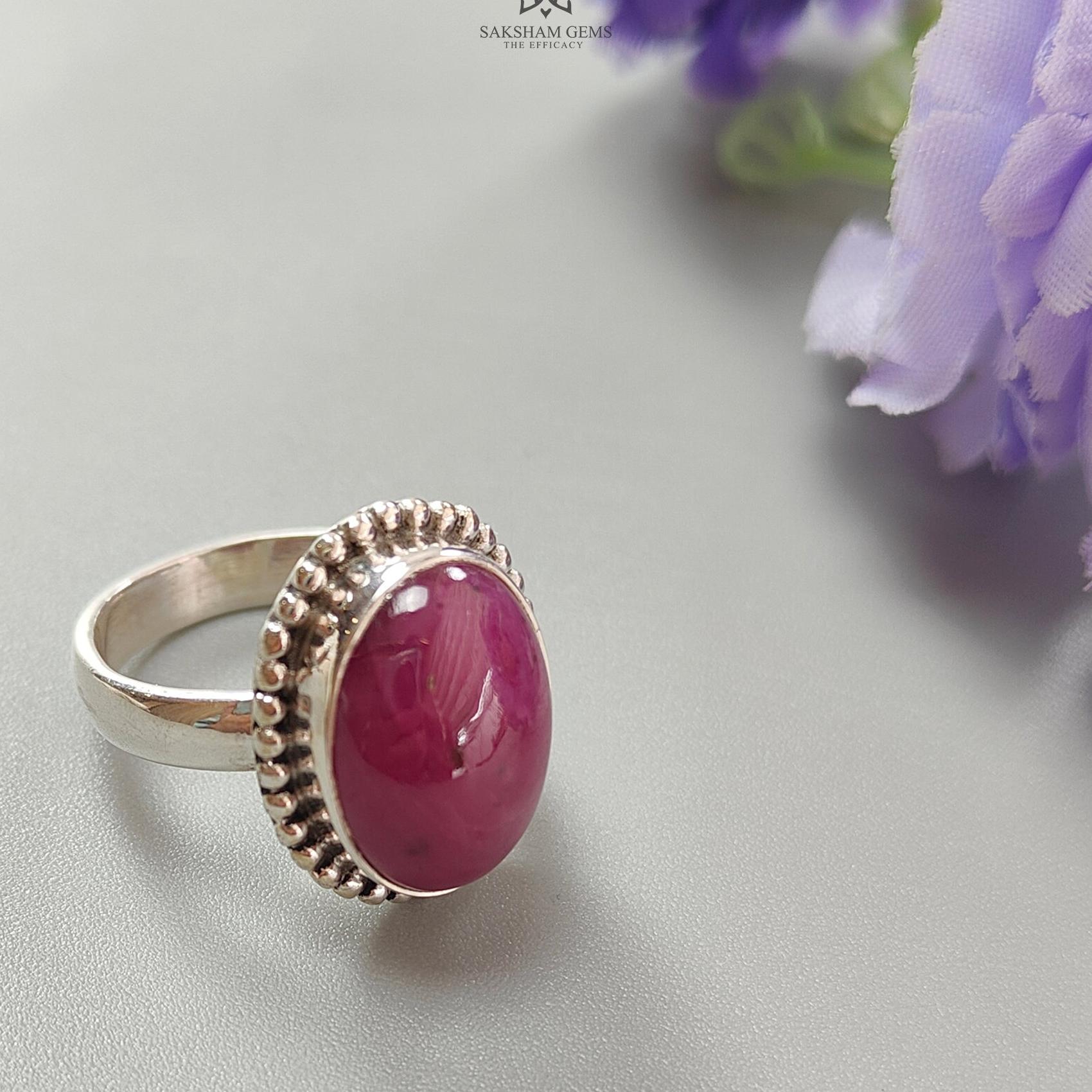 Red Ruby Silver Ring: 8.2gms. Natural Ruby Untreated Cabochon Oval Shape 925 Sterling Silver Bezel Set Ring 7.5 US