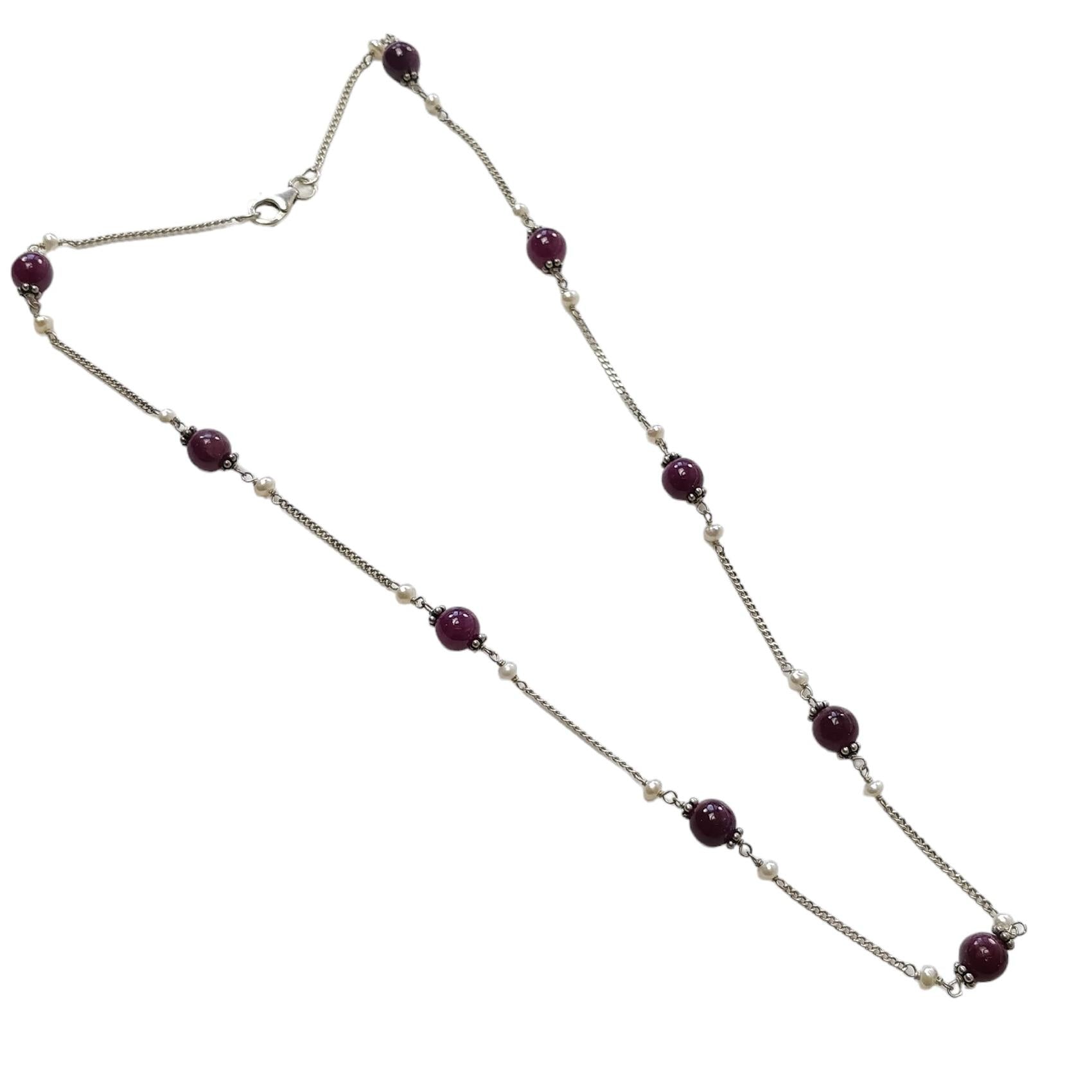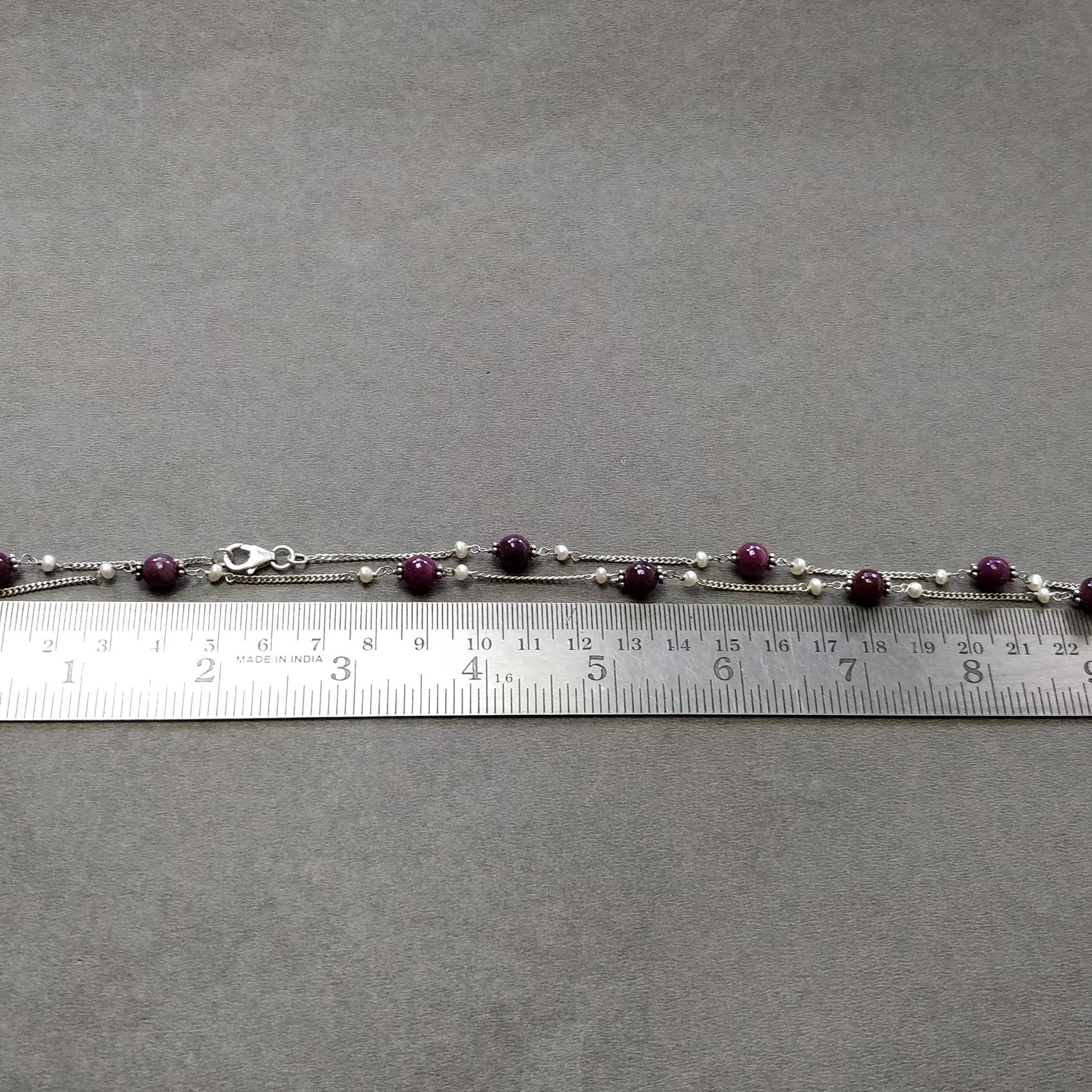 RUBY Gemstone Beaded NECKLACE : 10.52gms Natural Untreated Plain Round Shape Ruby & Pearl With 925 Sterling Silver 19"