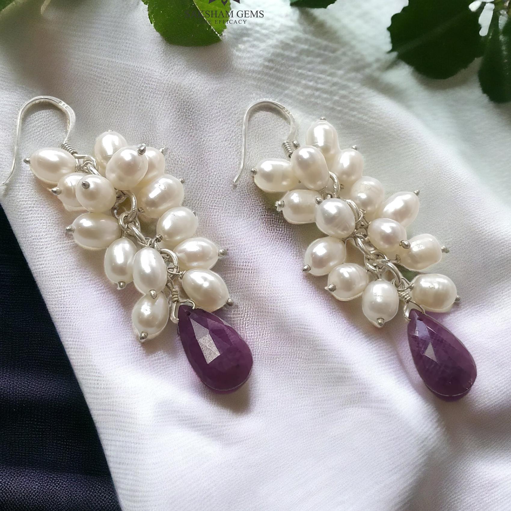 Beads Earring Ruby & Pearl Gemstone Silver Earring : 15.79gms Natural 925 Sterling Silver Drop Dangle Ear Wire Hook Beaded Earrings 2.5"