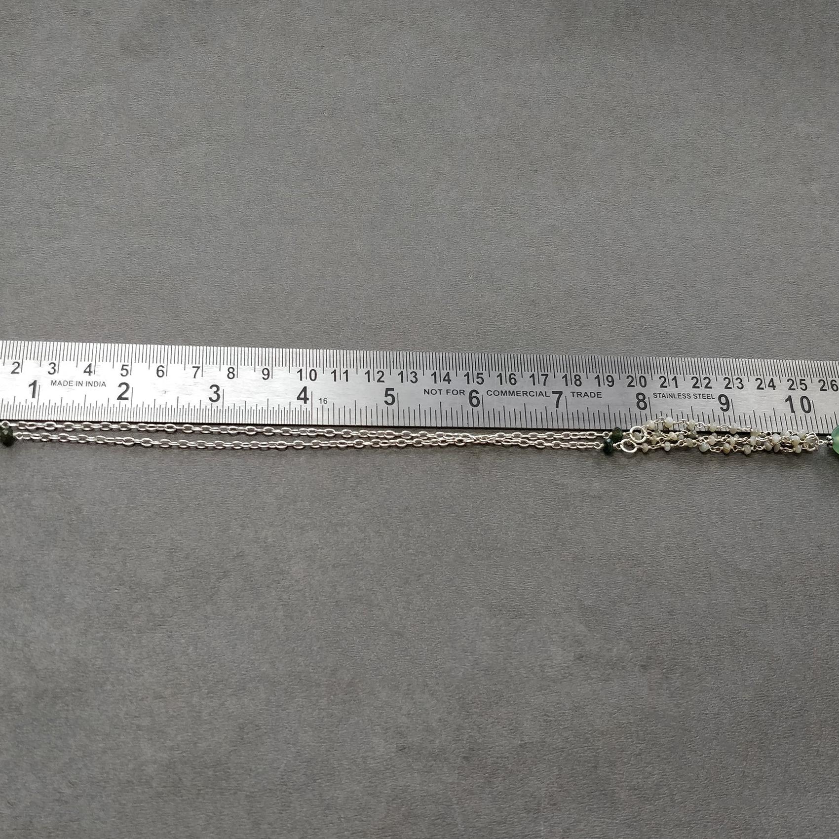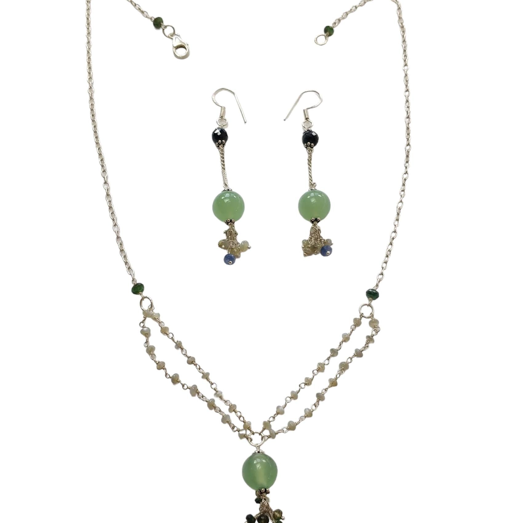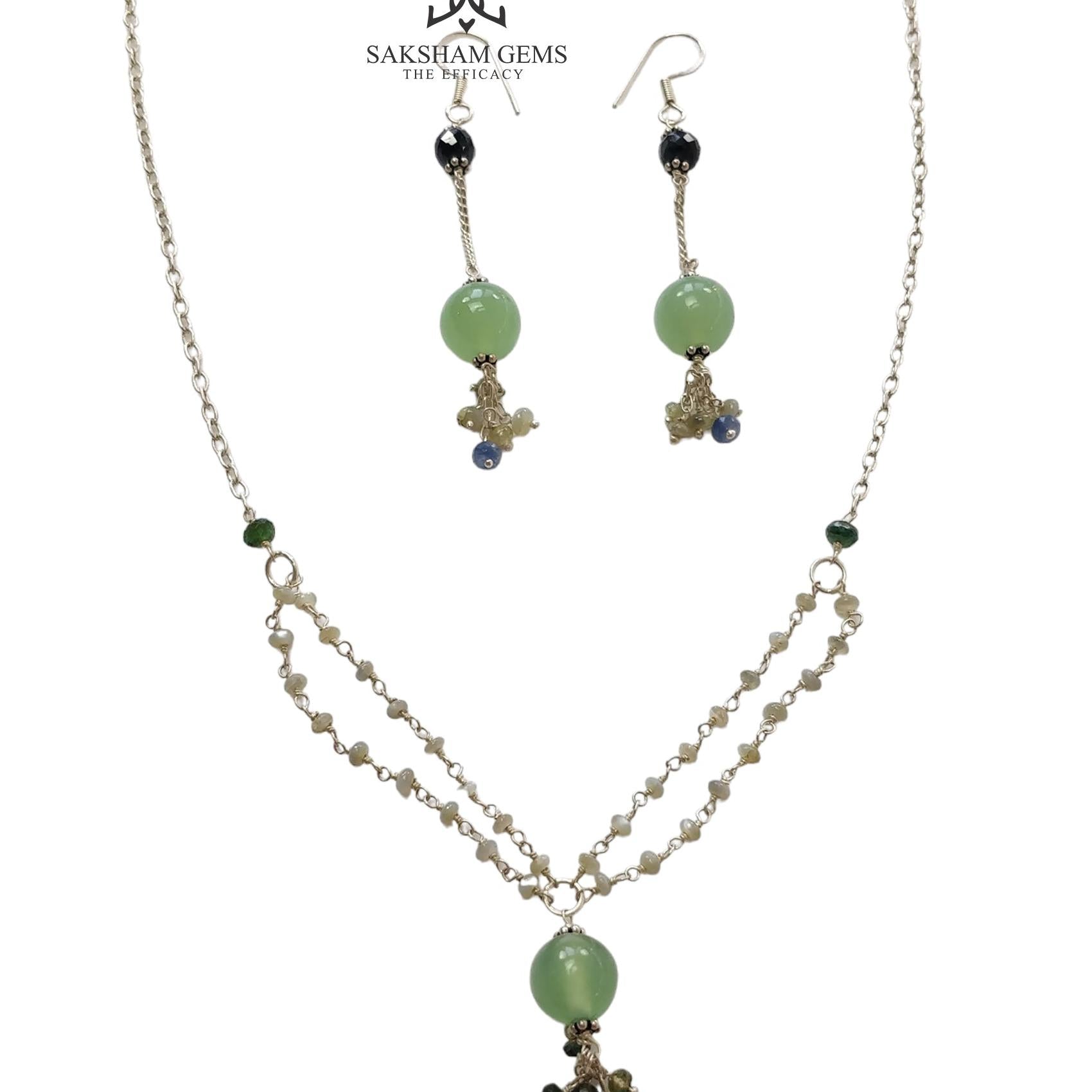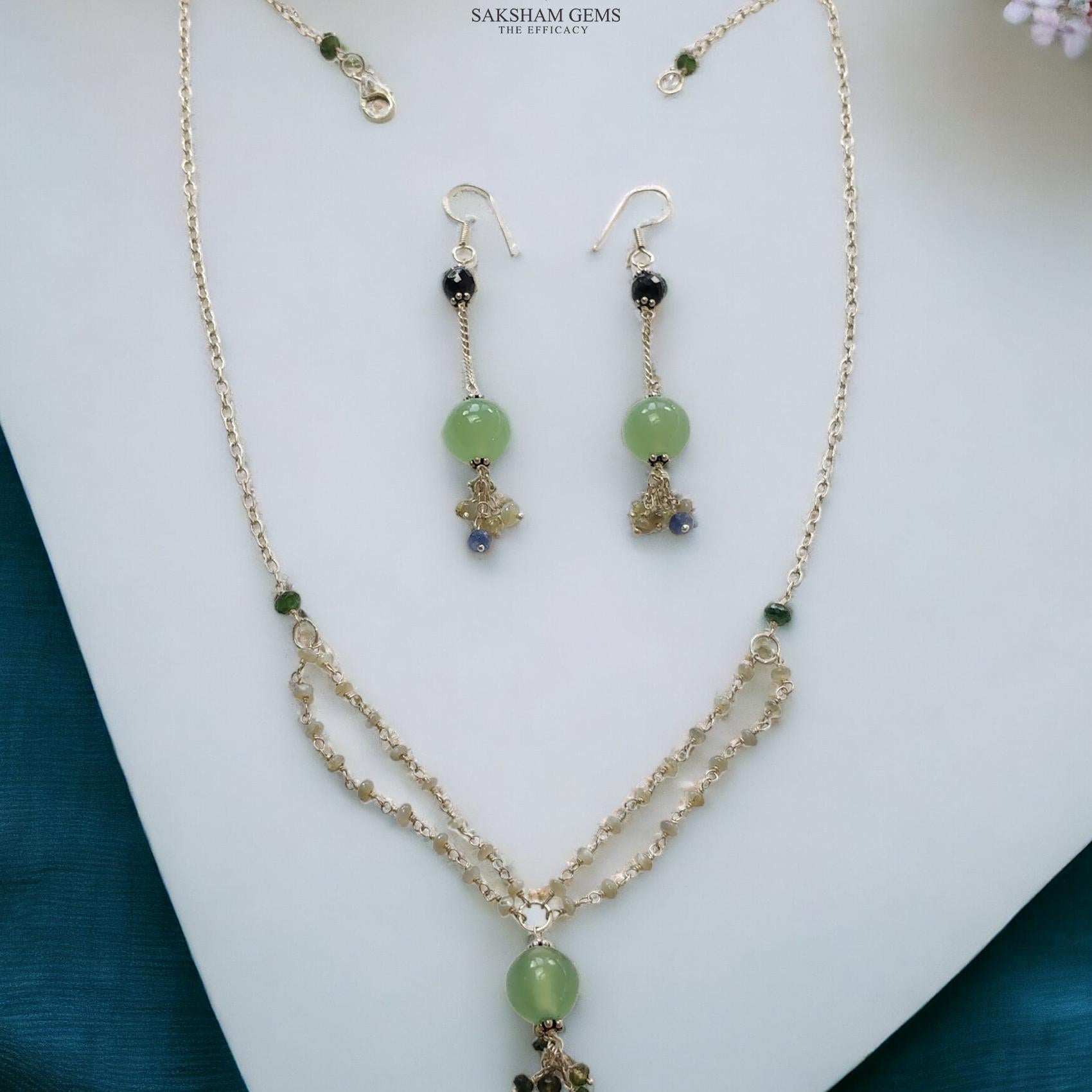 Serpentine & Chrysoberyl Cat's Eye Gemstone With 925 Sterling Silver Jewelry : 14.17gms Natural Round Shape Beaded Earrings Necklace Set