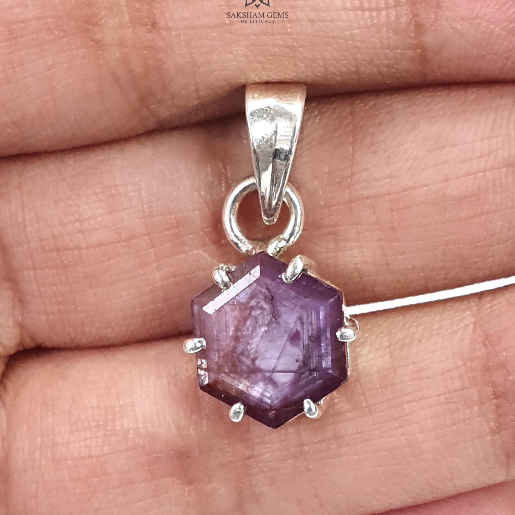 Raspberry Sheen Pink Sapphire Faceted Silver Pendant: 2.81gms Natural Untreated Sapphire Hexagon 925 Sterling Silver Prong Set 1" Pendant
