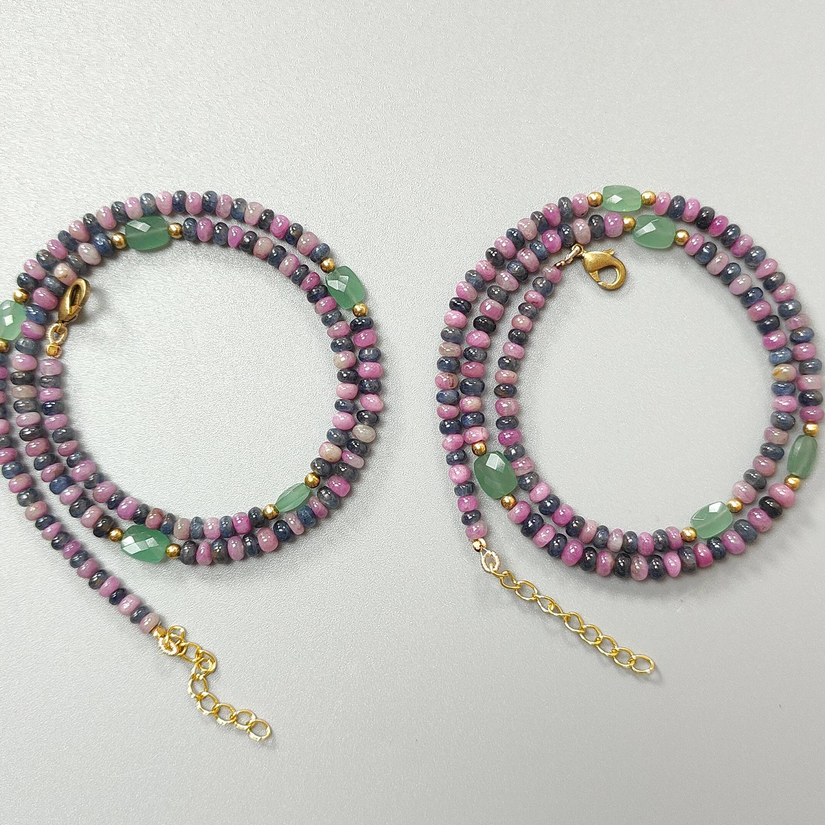 Zoisite Ruby & Blue Sapphire Gemstone Beads Necklace: Natural Untreated Ruby, Green Quartzite Plain Rondelle Brass Necklace 18" 1 Strand